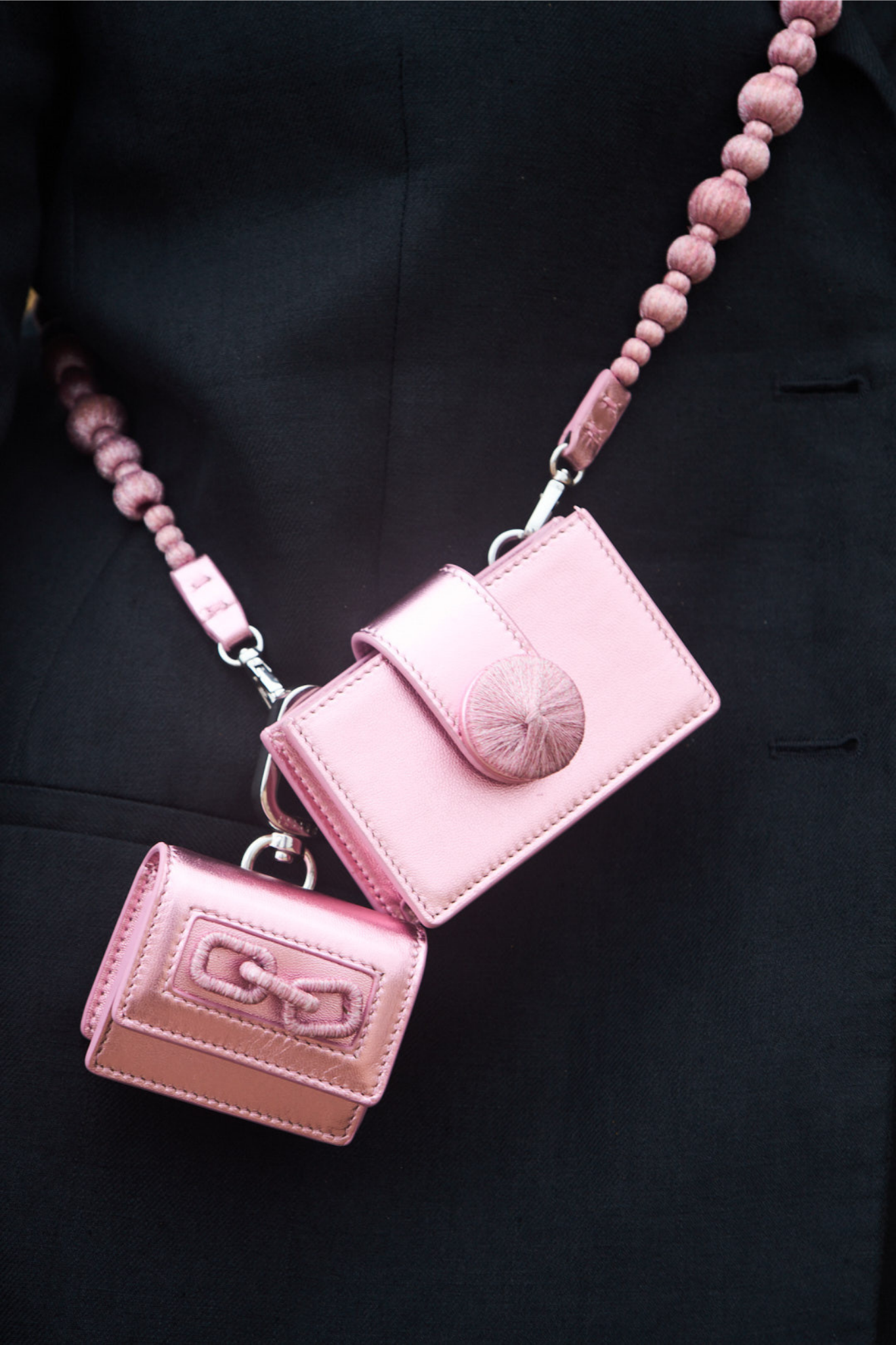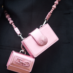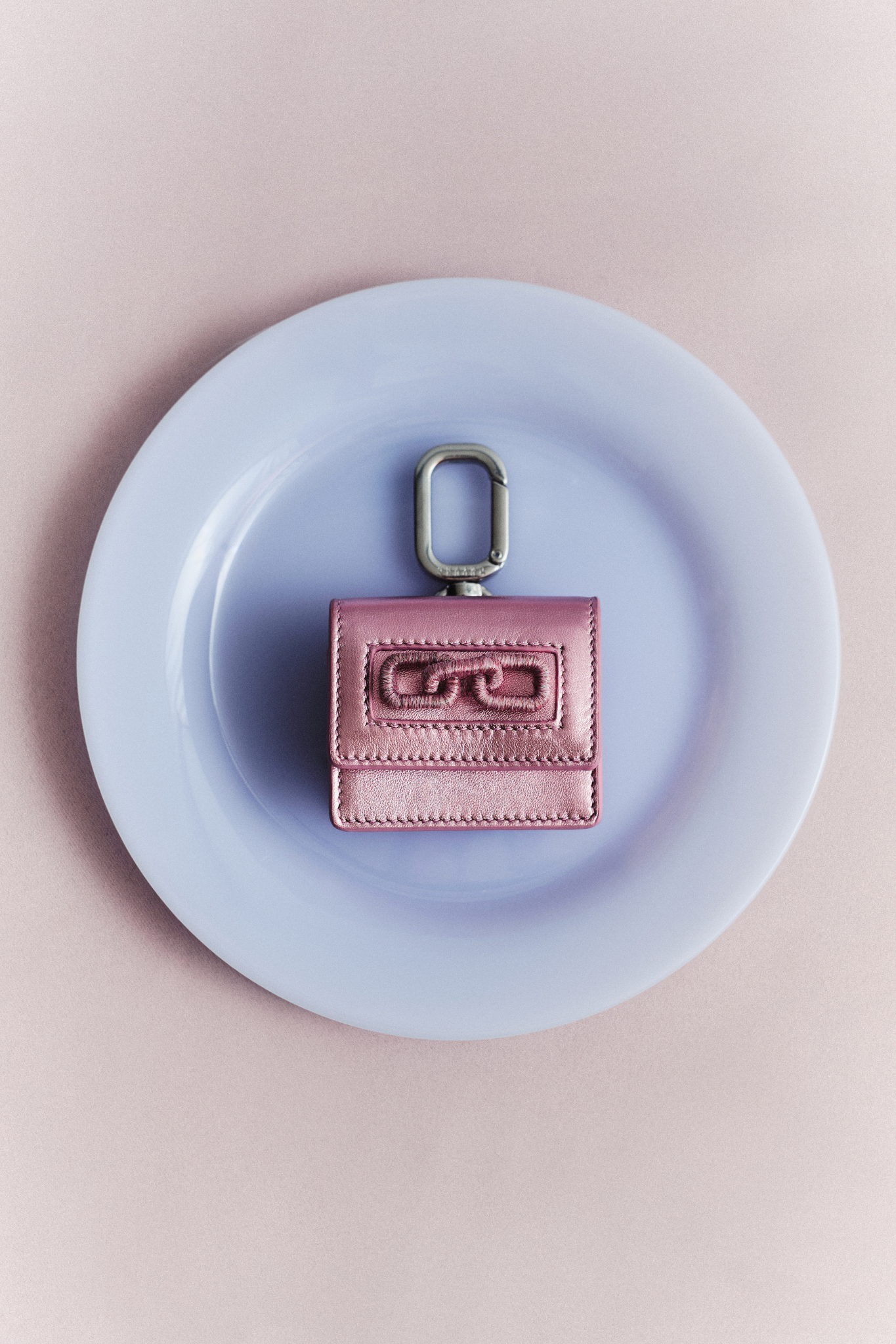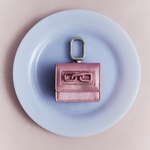 A sculptural accessory designed to carry your essentials in style. Handcrafted in Italy from supple metallic pink-toned leather with contrast stitching, it features a silver carabiner for effortless attachment to your bag or clothing. Finished with signature Catena chain detailing, this compact case blends function with refined craftsmanship.