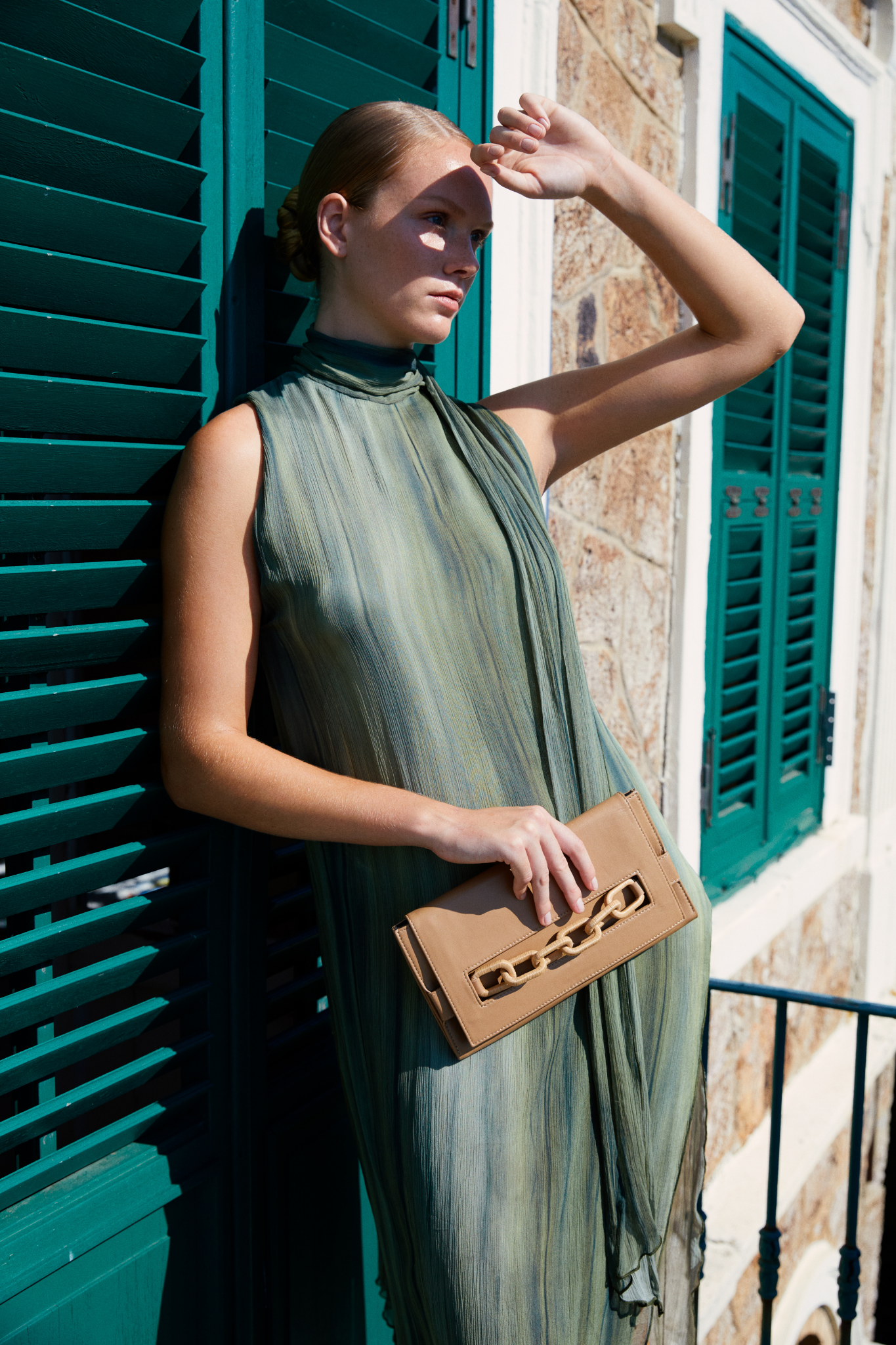 Catena Latte Envelope Clutch in Italian leather with raffia threaded chain, an elegant night accessory.