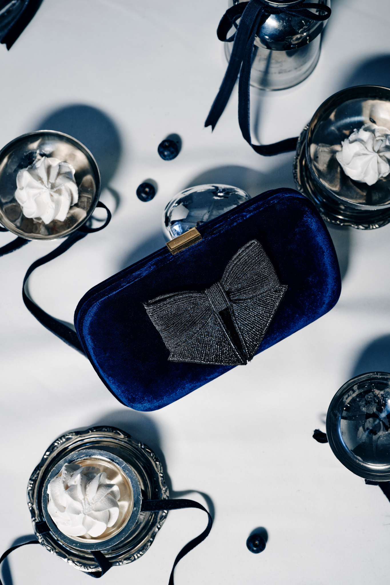 The perfect finishing touch for evening looks, the Fiocco Clutch Bag is a statement of understated elegance and playful glamour. Its structured, boxy silhouette is adorned with a shimmering metallic black bow, adding a touch of flamboyance to its sleek design. Draped from an elegant black rope strap, this piece is crafted in luxuriously sumptuous navy velvet, exuding sophistication. Perfectly chic for all winter occasions, it pairs effortlessly with your most dazzling ensembles, making it a must-have for seasonal soirées.