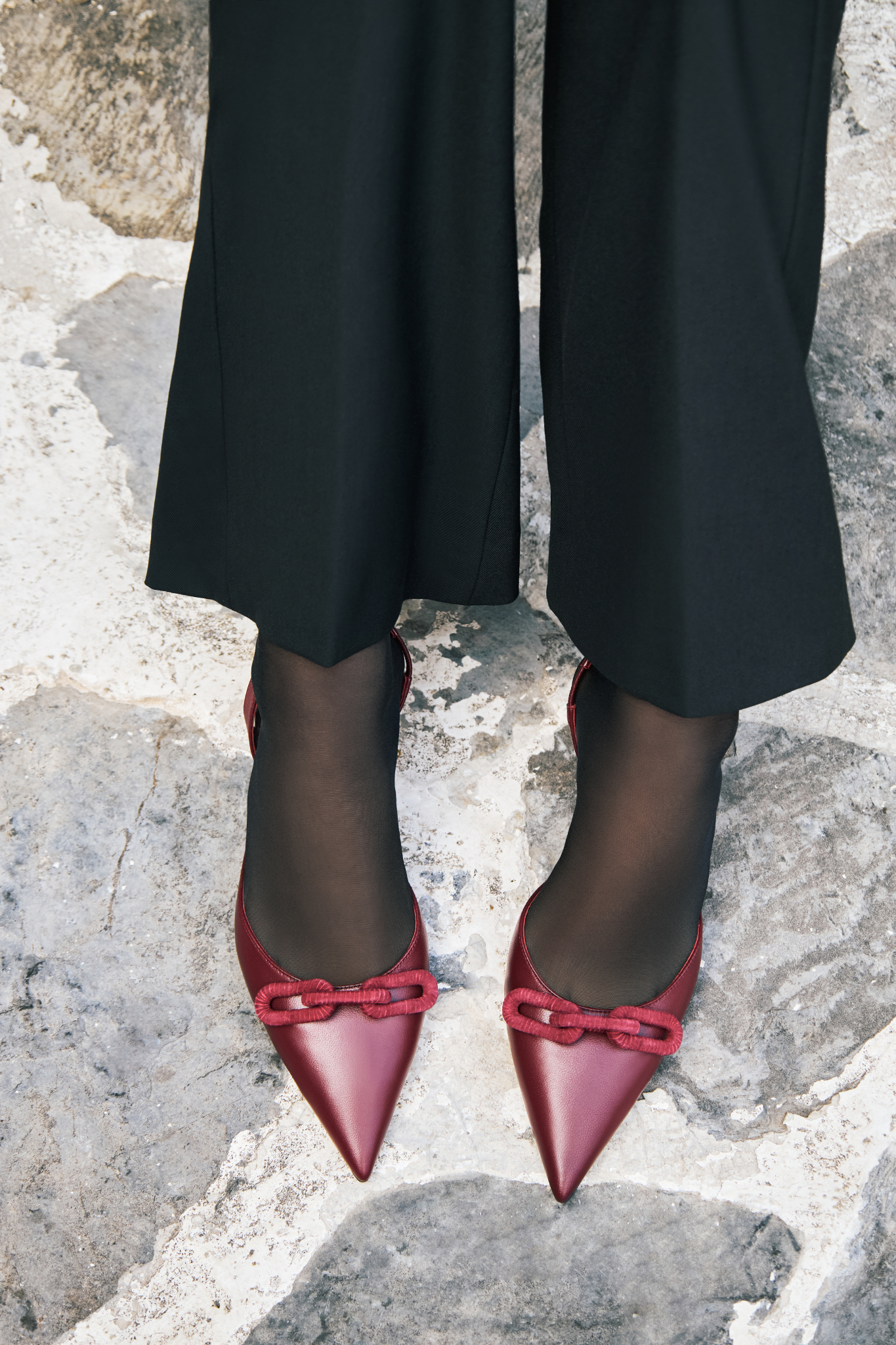 The Catena Mid-Heel Slingback Pump is a chic and timeless piece that will be your go-to when looking to add a touch of sophistication to any ensemble. A slender kitten heel with a closed toe, the shoe comes in a soft burgundy leather finish with a slingback strap that lightly embraces the ankle. The elegantly pointed toe is adorned with the signature Serena Uziyel chain link, composed from delicately hand-woven burgundy suede. Artful, refined and striking, the Catena Slingback Pumps are a piece to treasure for years to come.