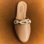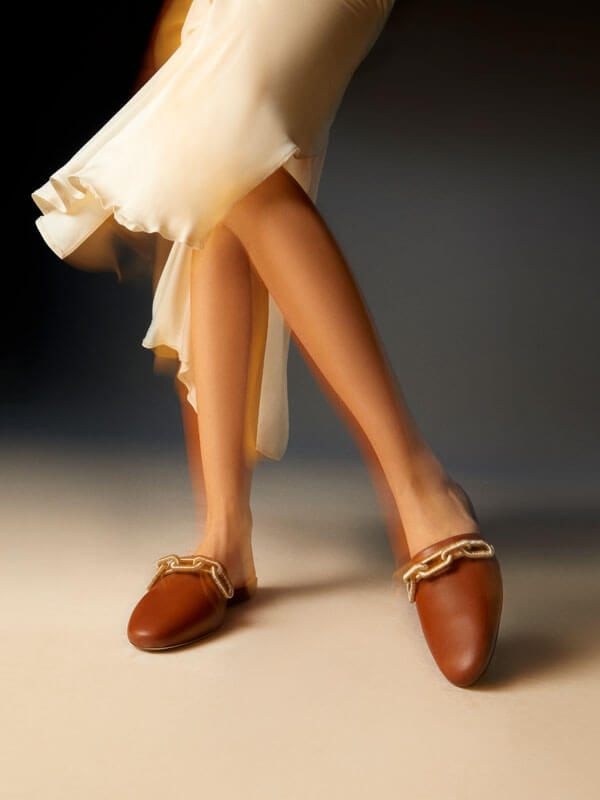 Meet the utterly feminine Catena sliperette, delicately crafted from luxurious camello colored leather and adorned with a breathtaking combination of gold and silver chain. With a dainty ten millimeters uplift, these sliperettes offer a subtle boost while preserving a beautifully feminine silhouette. Slip into the captivating Catena sliperette and embrace the magnetic allure at every step.