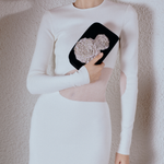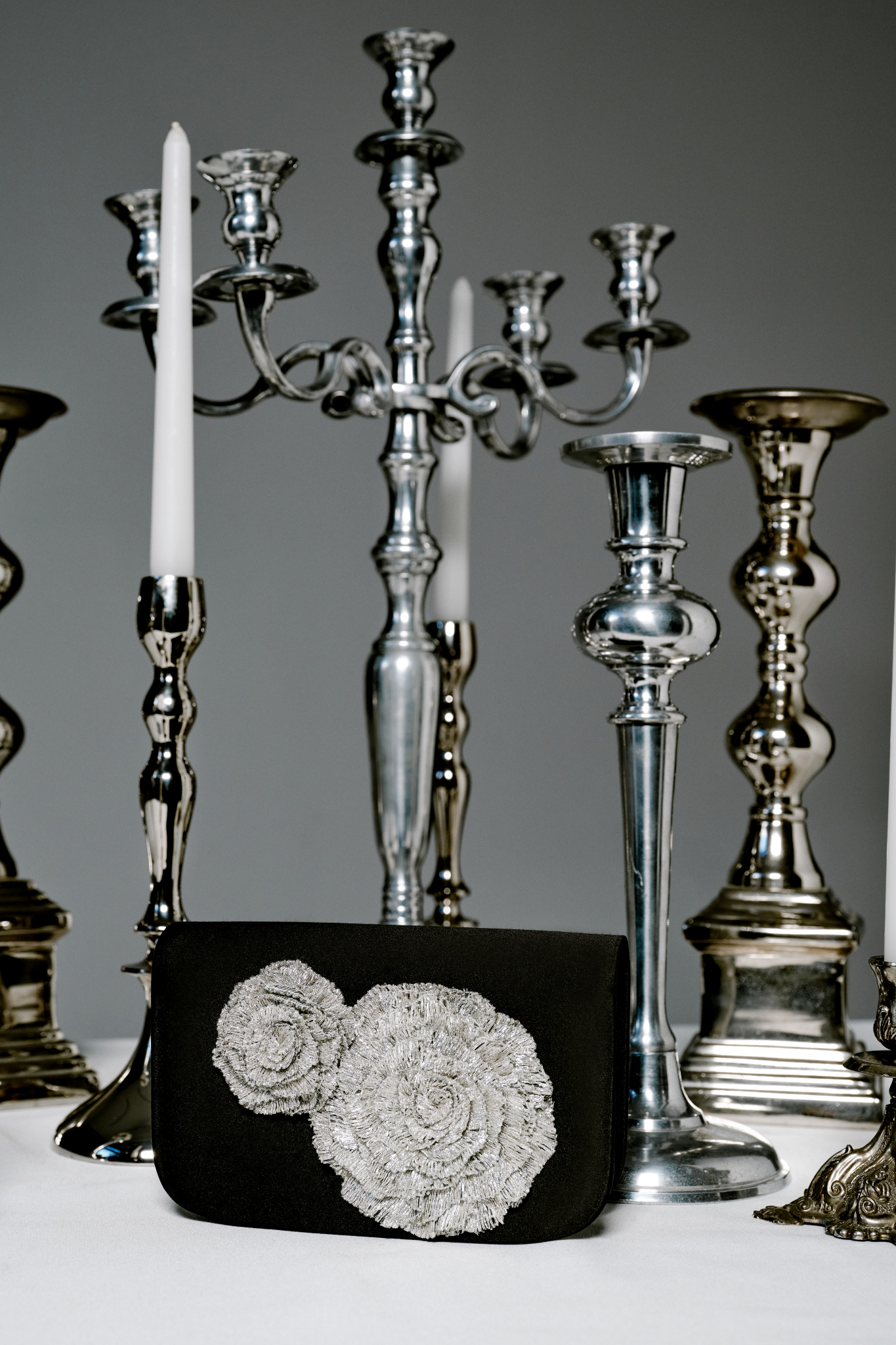 Meet the enchanting Lavinia Two-Sided Clutch, where elegance meets allure. A true showstopper, this clutch features a signature Florette embellishment that takes center stage, atop the sleek black satin built. The exquisite metallic embroidery adds a touch of opulence and elevates the overall femininity, casting a spell of elegance.