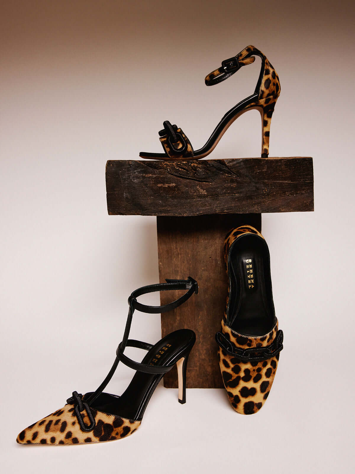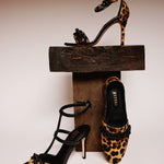 The Catena High Ankle Sandal’s provide a subtle and chic look. The sleek leopard calf hair goes harmoniously with the black, creating an elegant refinement. The matte black chain embroidery brings luminosity with contrast to the shoe. It’s ninety millimeter heel offers just the right amount of lift providing comfort and delicacy.