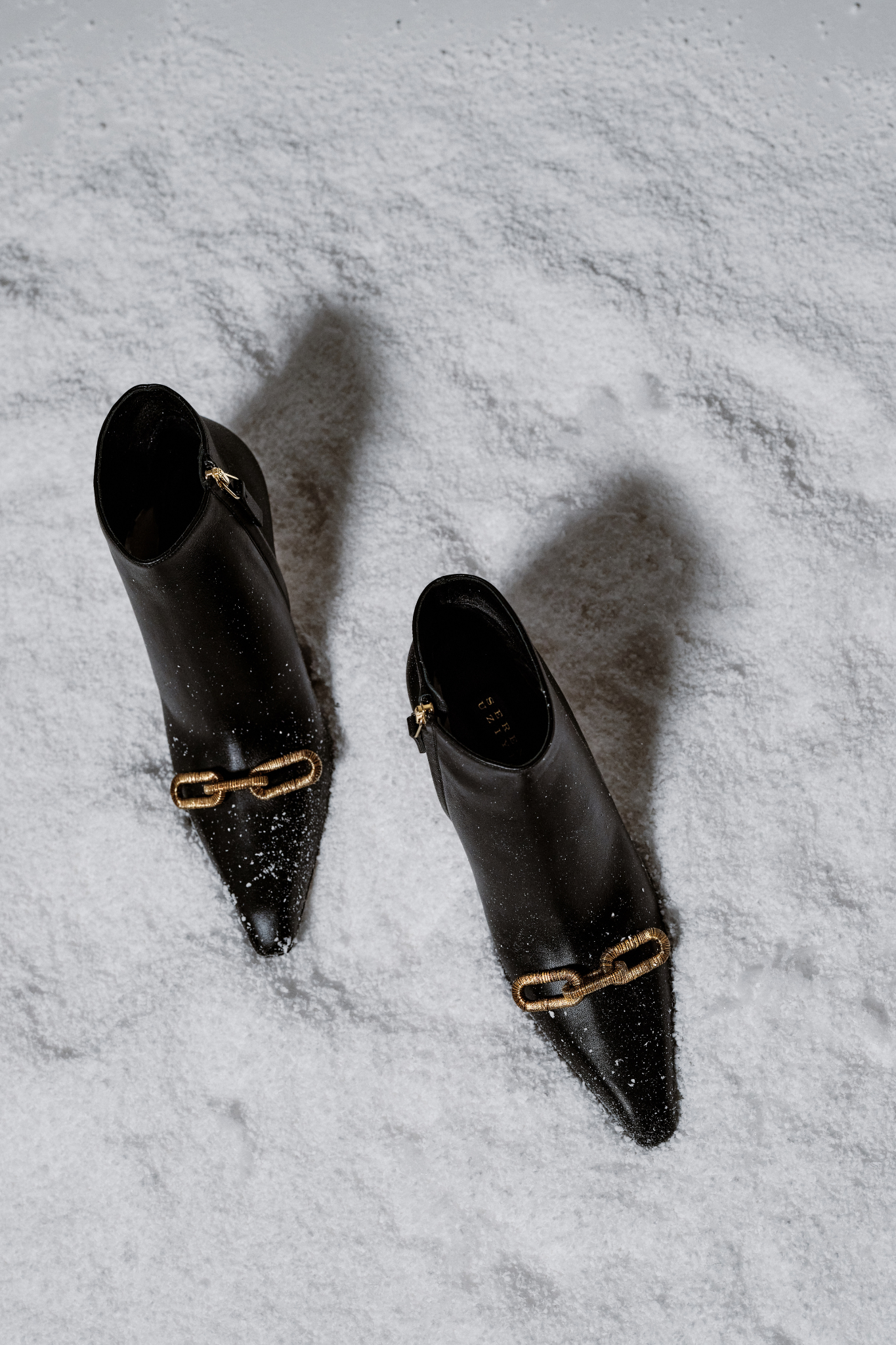 Timeless, versatile and flattering, the Catena Ankle Boot has been crafted in Italy from smooth black leather. With an elongated pointed toe and a 75mm heel, the elegant toe features a buckle like adornment composed of the signature Catena Chain Link, intricately wrapped in glimmering golden threads. Style with midi dresses and cropped tailoring for a sophisticated look.
