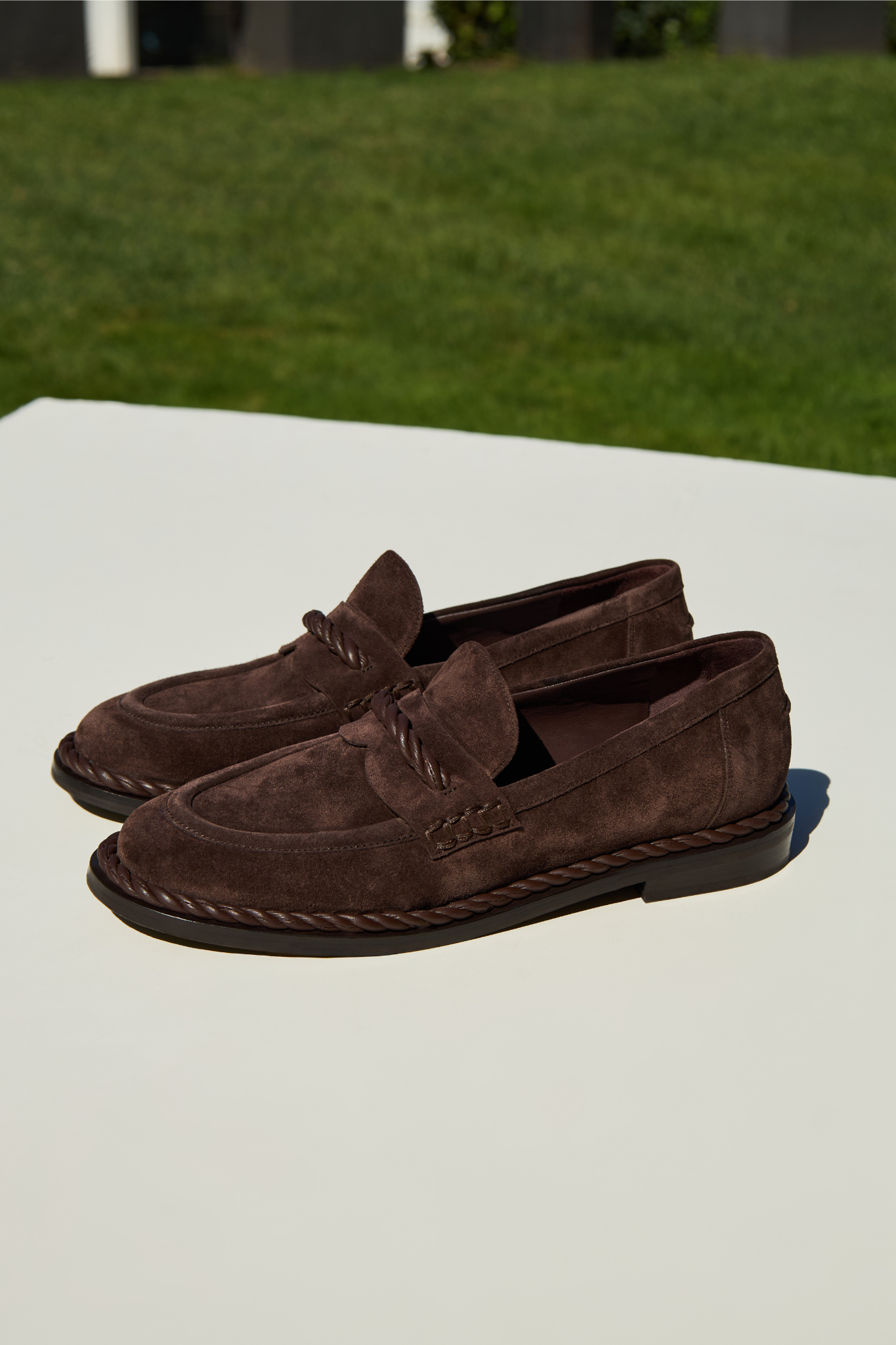Crafted in Italy from smooth dark brown suede, the Hedera Moccasin is a timeless design elevated with distinctive artisanal detail. Moccasin-inspired stitching frames the silhouette, while a twisted leather rope adorns the front like a sculptural buckle and continues seamlessly around the sole. Set on a subtle 20mm stacked heel, these shoes offer just the right amount of lift for everyday ease. A classic reinterpreted with precision and care, they bring enduring craftsmanship to modern wardrobes.