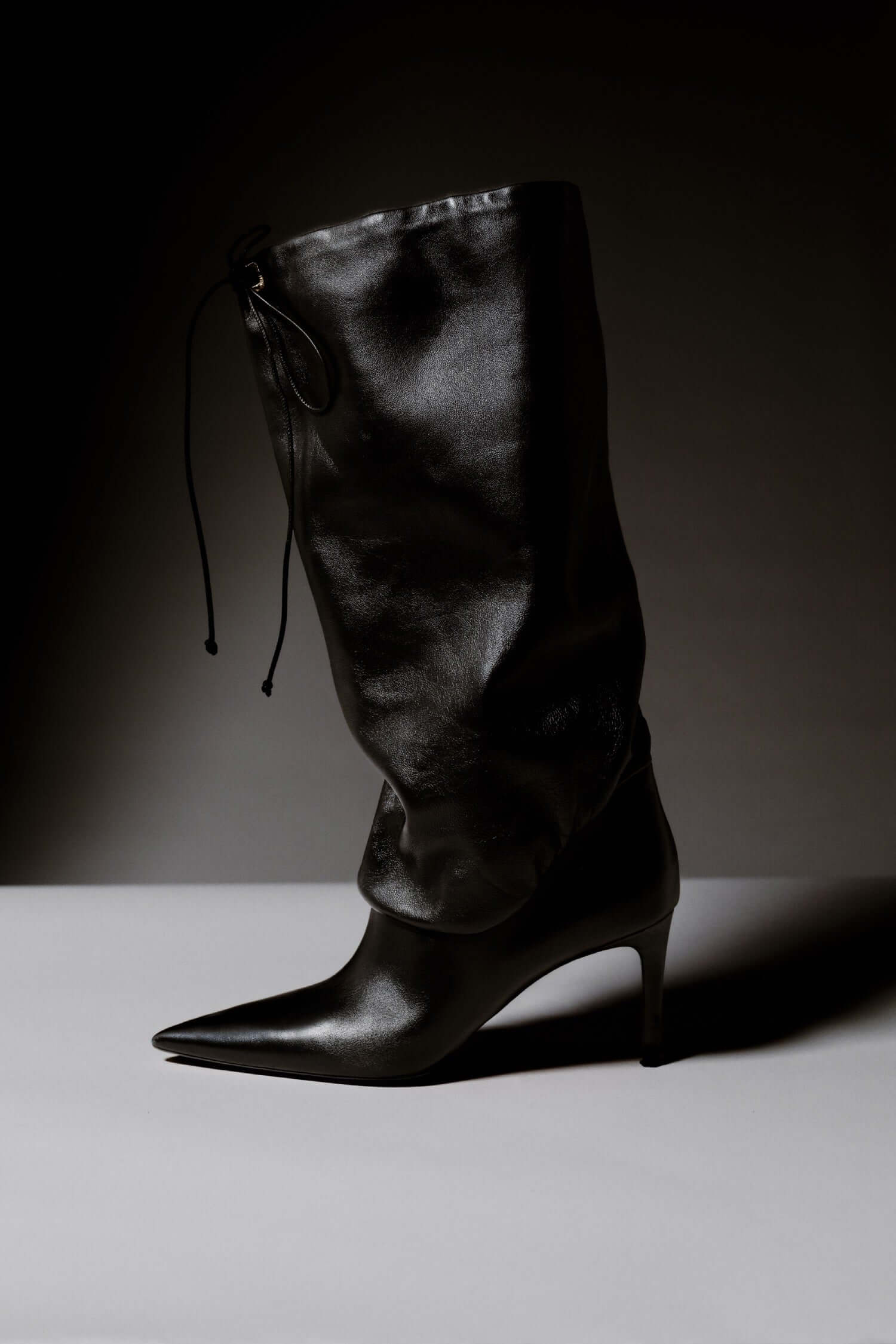 Expertly crafted in Italy from a supple black leather, the Catena Notte knee-high boot features a sharply pointed toe, the silhouette of which is accentuated by a slouchy and ruched profile. A blend of luxe bohemia and sleek sophistication, the boot is set on a slender 70mm heel with a drawstring of Serena Uziyel’s signature antique metallic threads. A statement piece for cold-weather ensembles, show the Catena Notte Knee Boot off under midi and mini hemlines.