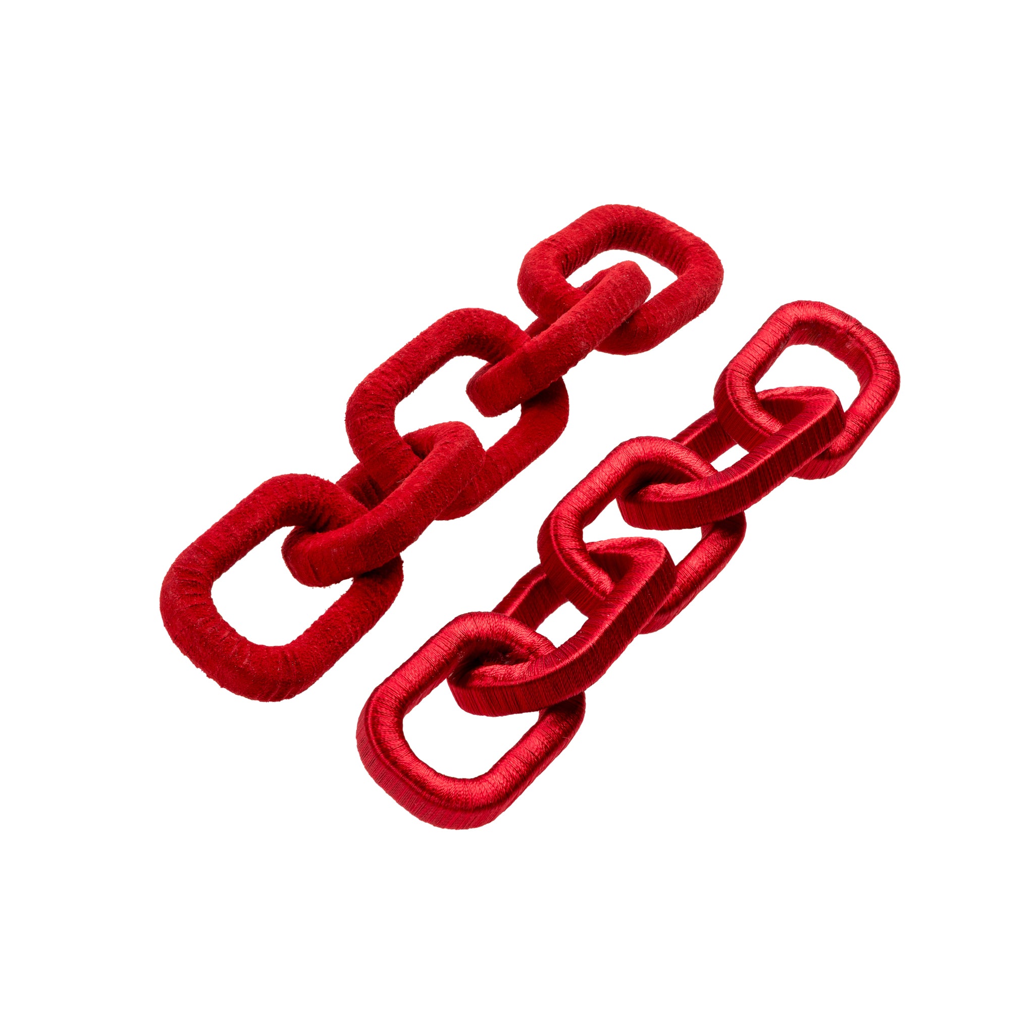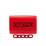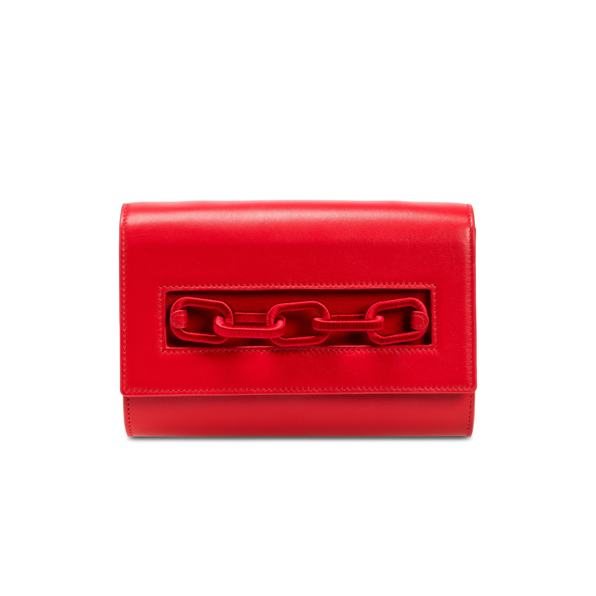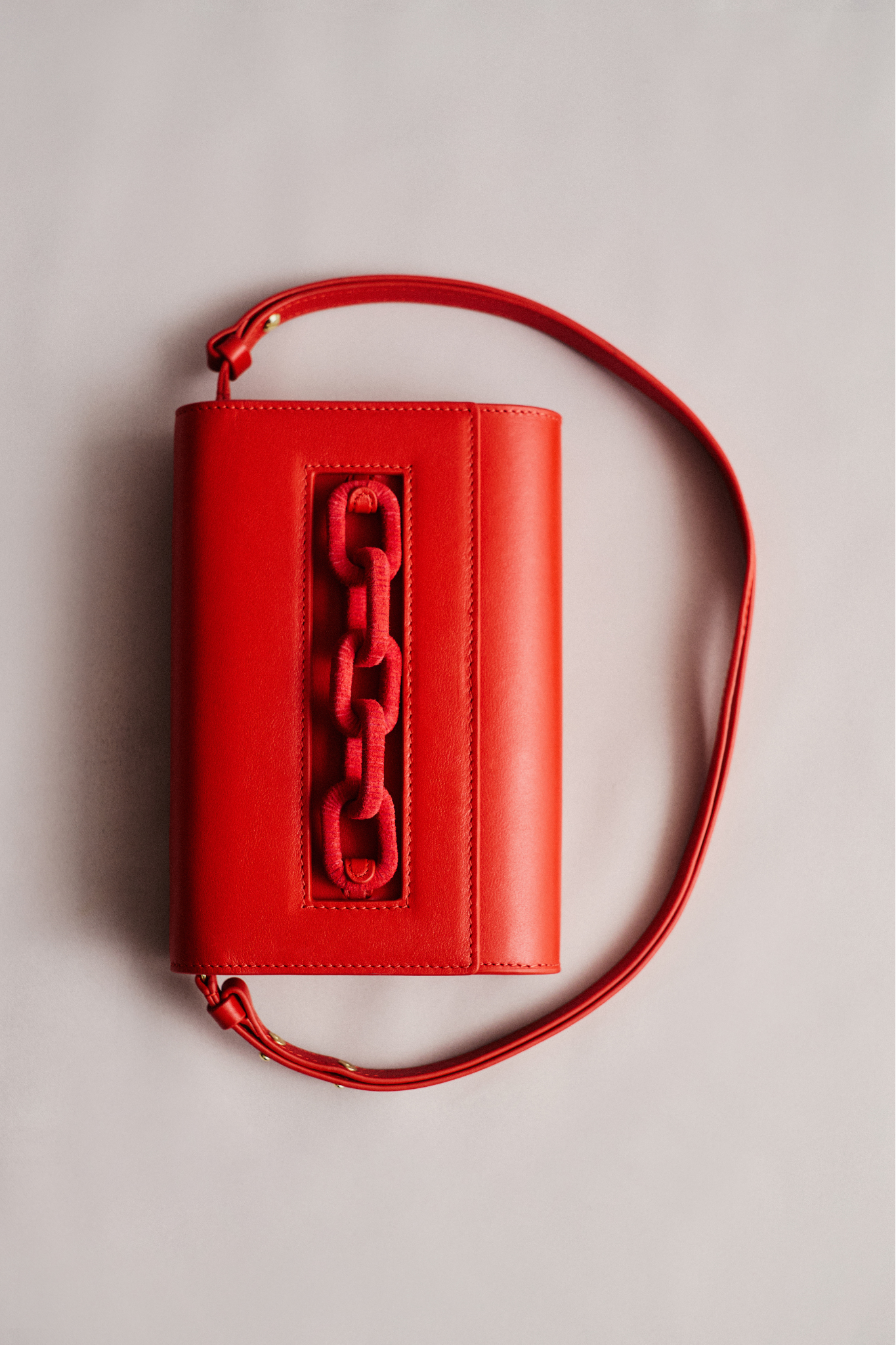 A discreet window reveals the signature Catena chain, embroidered in scarlet thread. The bag includes two interchangeable chain finishes: the original thread wrapped chain and a suede-wrapped option, allowing subtle variation in texture and tone.