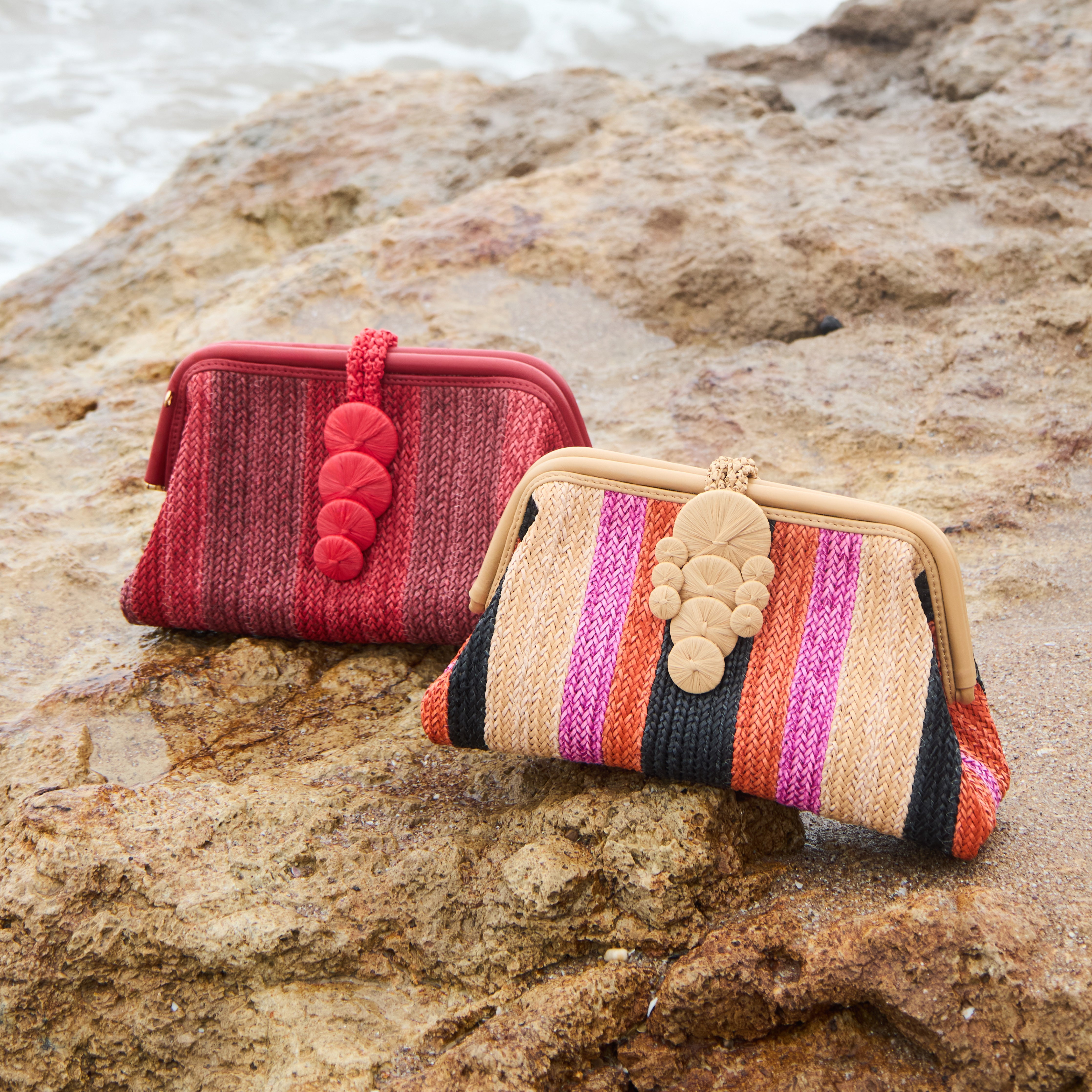 The Alessa Pouch Bag combines bohemian flair with the finest of craftsmanship. Expertly made by hand in Italy, this is a clutch bag with a softly structured shape that will neatly hold your phone, wallet and keys. Two-tone crimson leather and fabric have been woven into braided stripes, topped with an intricately knotted and layered design of thread-wrapped rings. This elegant embellishment doubles as the fastening in addition to a magnetic tab. The perfect accent to pair with an evening gown, or a bold accessory to elevate a daytime look.