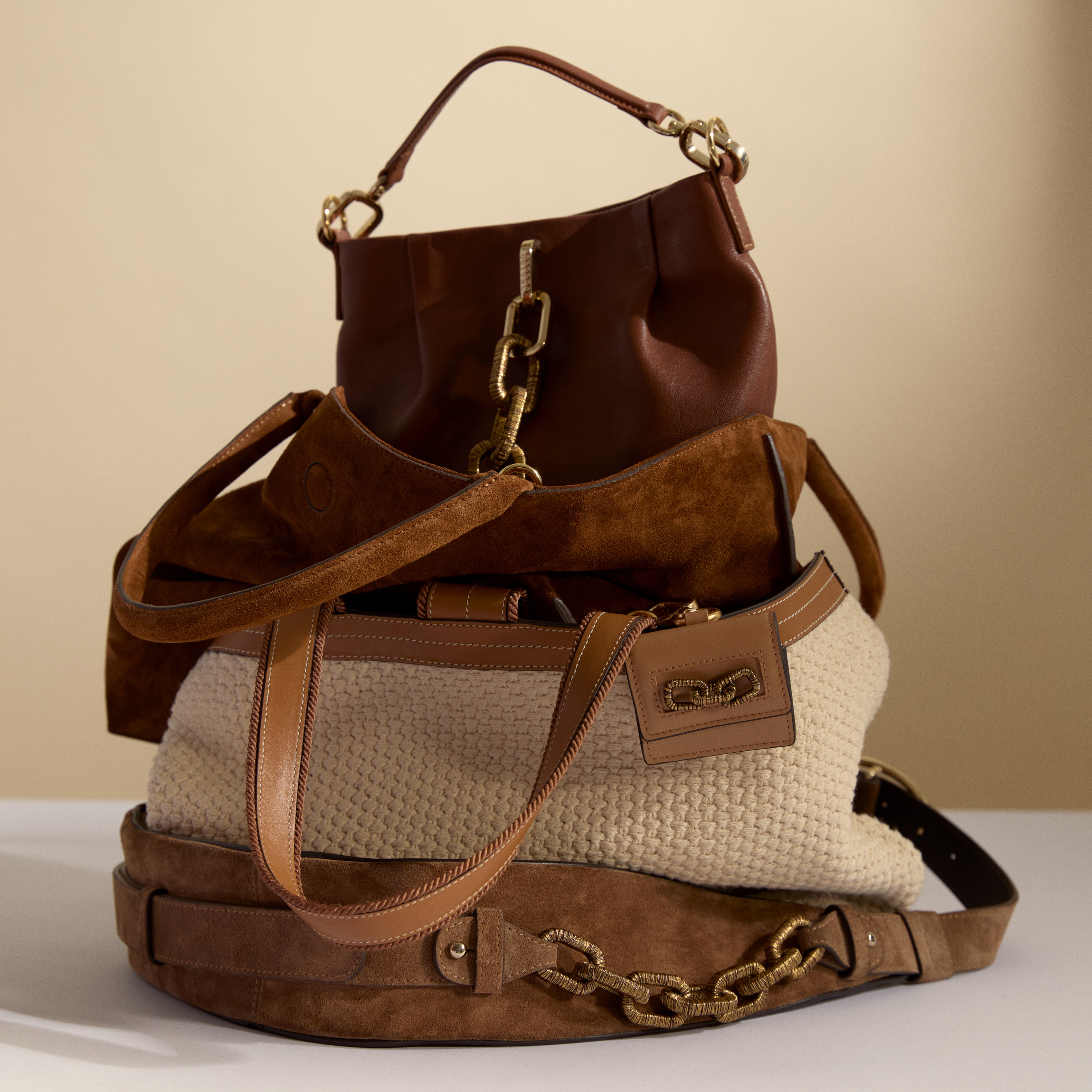 Catena Shoulder Pouch Bag is a petite and elegant shoulder pouch, inspired by soft, sculptural silhouettes that embody refined sophistication. Crafted in Italy by skilled artisans from supple leather or soft suede, it features two detachable straps—one short, one longer—for versatile styling, as well as a Catena chain link strap that drapes like jewelry when not in use.