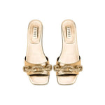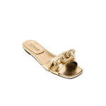 Crafted from pure gold Italian leather, the Catena Sliperette features antique gold and silver threads that are bound together to create rectangular chain shaped embroidery for contrast. The flat structure and the tactility of the beautiful leather will comfort your steps with delicacy.