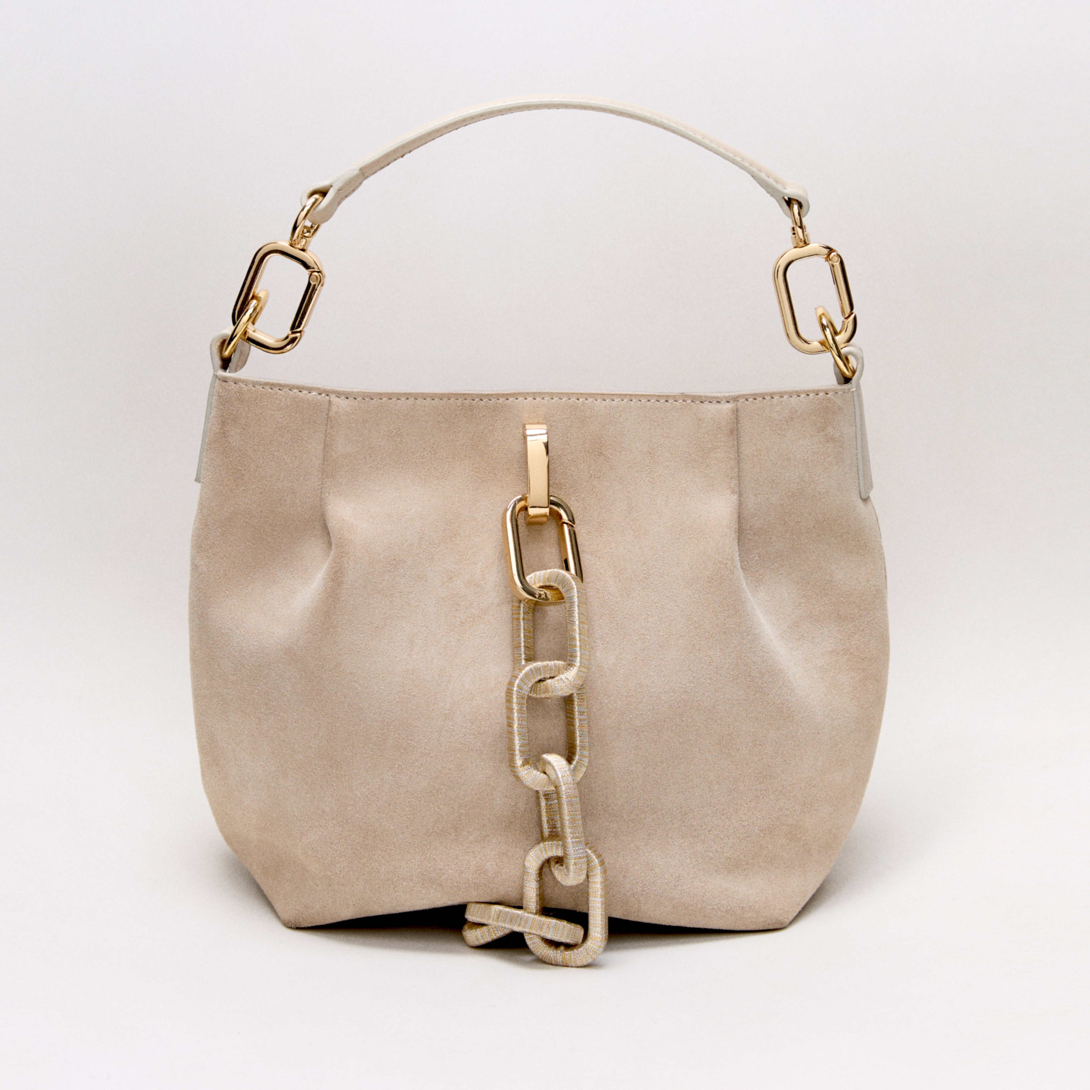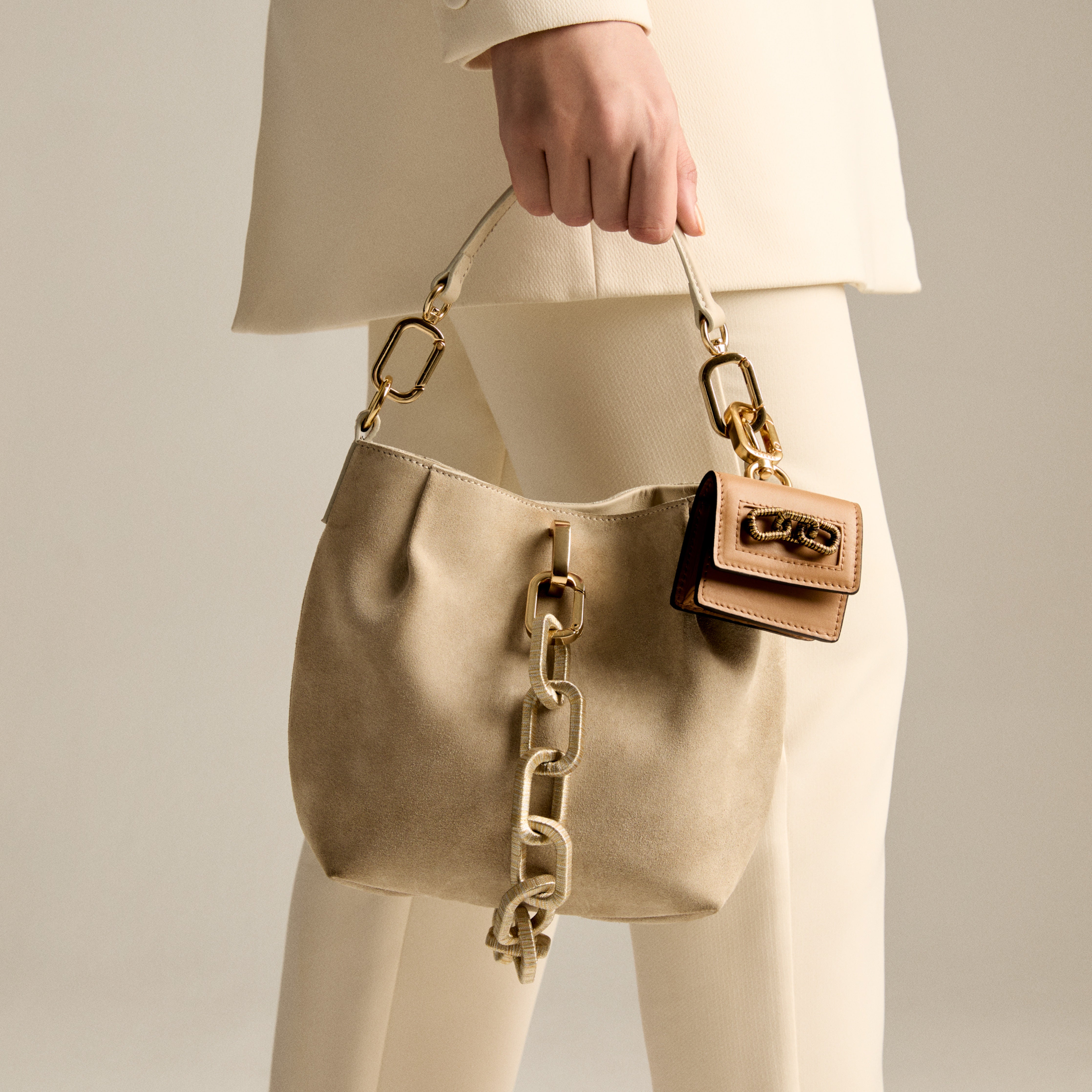 Catena Shoulder Pouch Bag is a petite and elegant shoulder pouch, inspired by soft, sculptural silhouettes that embody refined sophistication. Crafted in Italy by skilled artisans from supple leather or soft suede, it features two detachable straps—one short, one longer—for versatile styling, as well as a Catena chain link strap that drapes like jewelry when not in use.