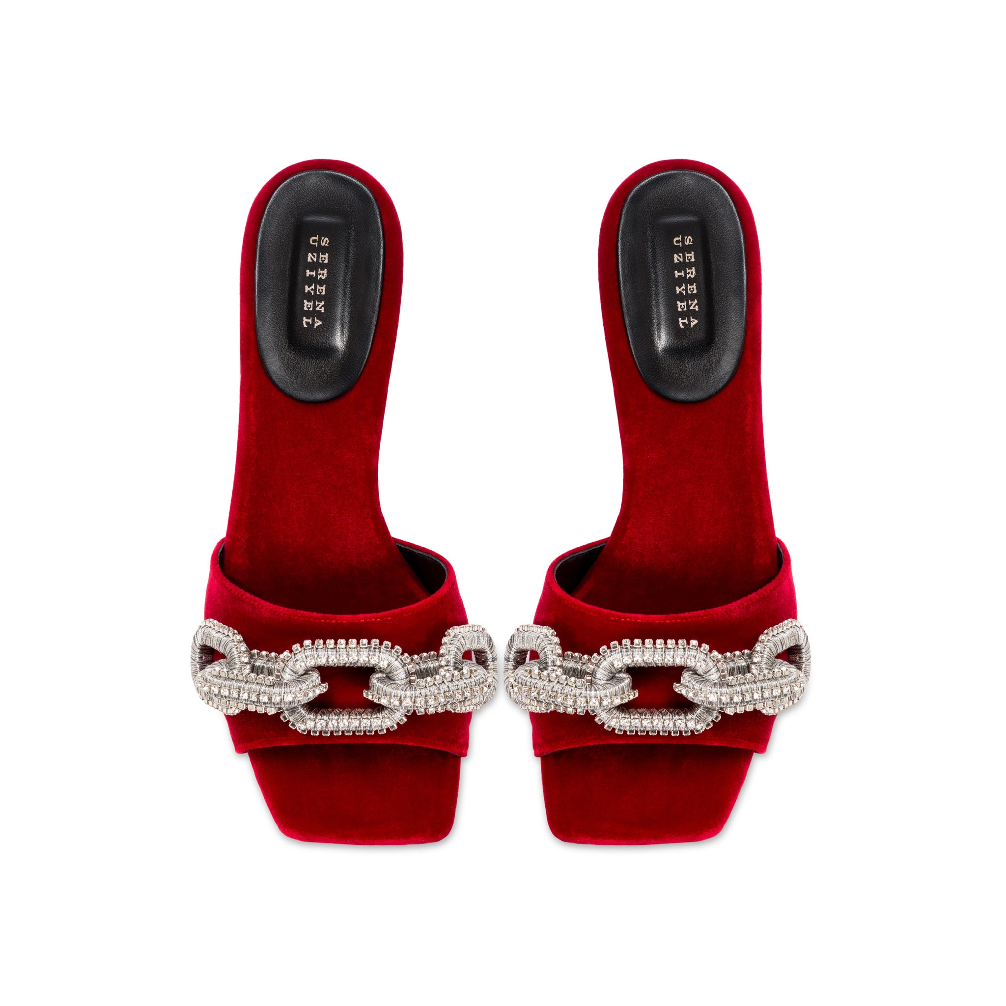 Boasting a sleek silhouette accented with delicate glimmering crystals, the Catena Scarlet Glam Sandals exude golden-era glamor. Set on elegant 90mm stiletto heels with padded insoles for extra comfort, the open-toe mules are crafted delicately in Italy from a sumptuous scarlett colored velvet. The focal point of the shoe is undeniably the exquisitely handcrafted strap. Signature Serena Uziyel catena chain links are delicately wrapped in metallic threads, then wrapped again with crystal embellishments. The Catena Scarlet Glam Sandals are the perfect finishing touch to a celebratory ensemble, sure to accompany you well through the finer hours.