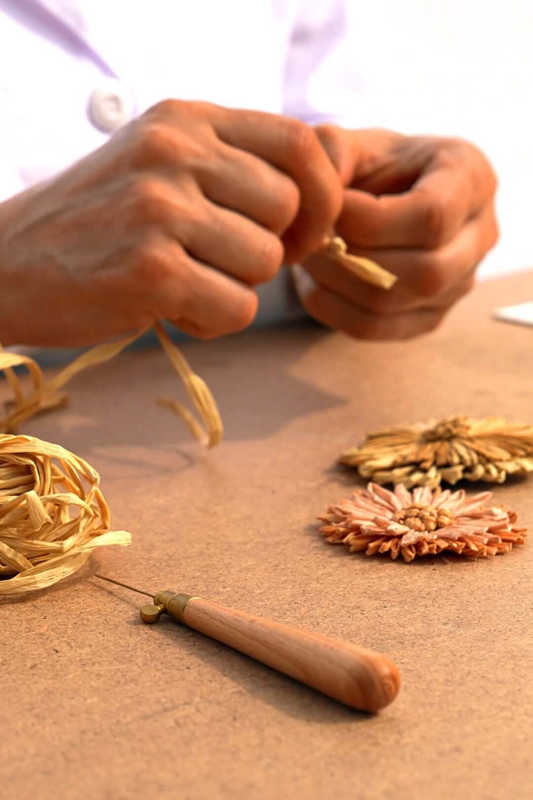 Ancient techniques meet generations of tradition and cherished communities of artisans. Hours of intricate handcraft and meticulously stitched natural threads create each and every delicately woven Narcissa flower.