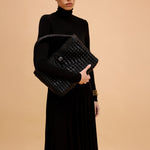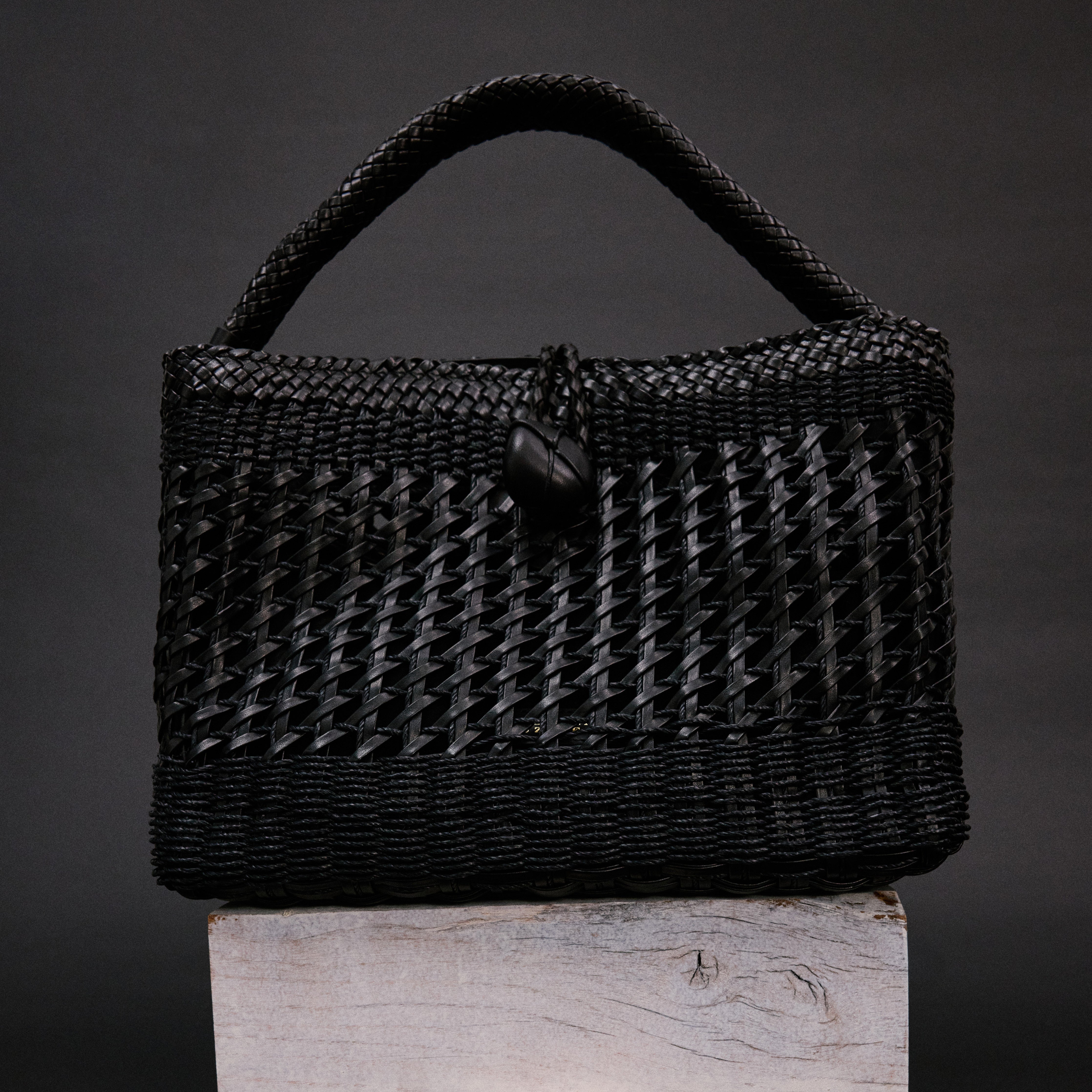 Almeria Tote Bagi is a combination of woven leather and raffia fibers, resulting in pieces to treasure for years to come. This boxy basket style tote is carefully constructed from a soft and pliable, glossy black leather with a sturdy raffia base and tightly braided leather handle. With a natural stone fastening and capacious interior, the Almeria Tote is perfectly size to fit all your daily essentials.