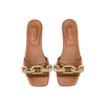 Crafted from pure camello Italian leather, the Catena Flat Sandal features antique gold and silver threads that are bound together to create rectangular chain shaped embroidery for contrast. The flat structure and the tactility of the beautiful leather will comfort your steps with delicacy.