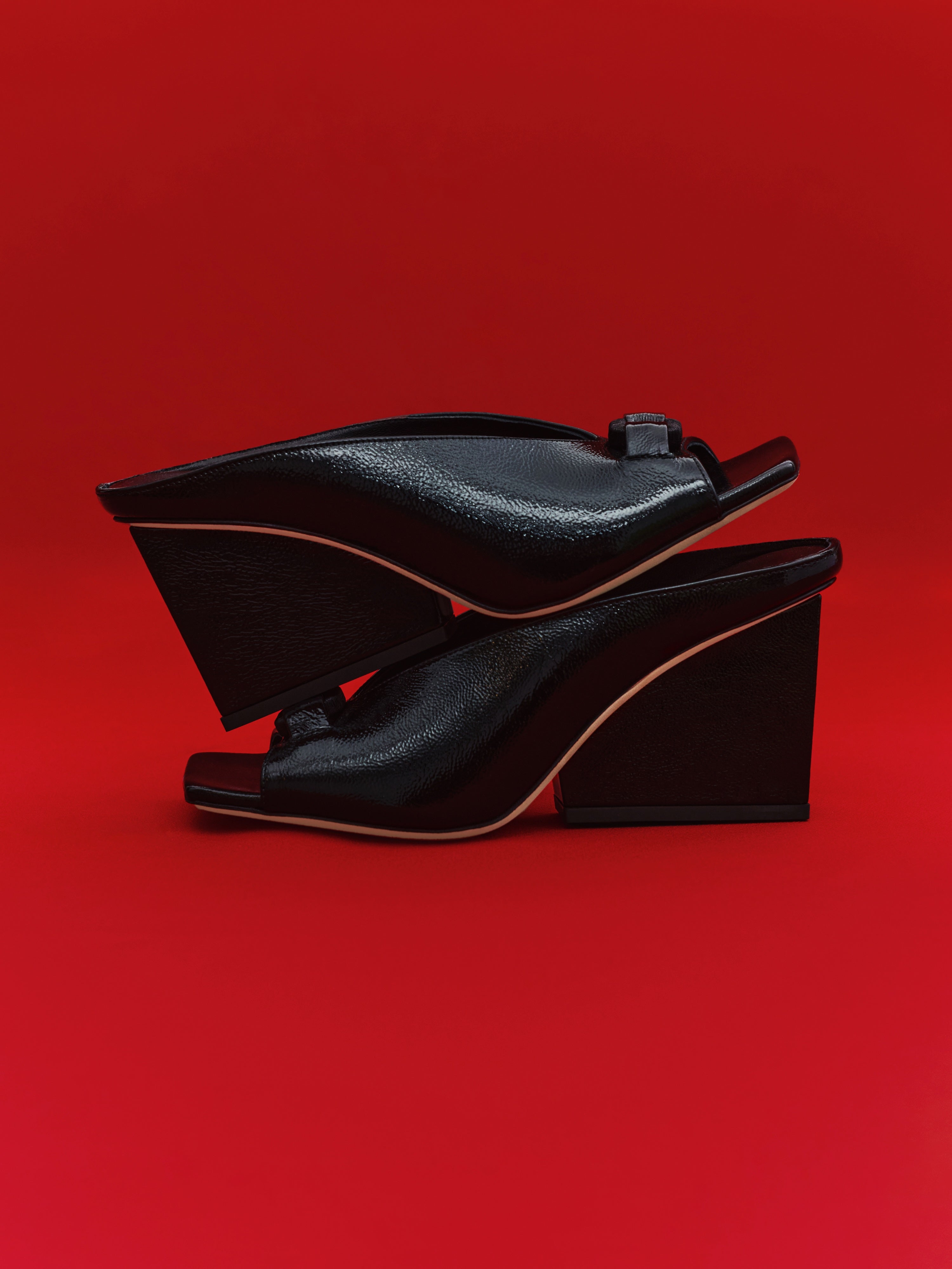 Italian-crafted and sculptural, the Catena Wedge reimagines the mule with an architectural 80mm heel and a modern square toe. A single, stitched Catena link sits at the vamp as a minimal, jewel-like accent, adding quiet dimension without overpowering the silhouette. Offering an easy slip-on fit and a confident yet comfortable lift, it comes in leopard calf hair, sleek black leather, and bronze bubble leather—each pair delivering polished edge from day to night.