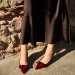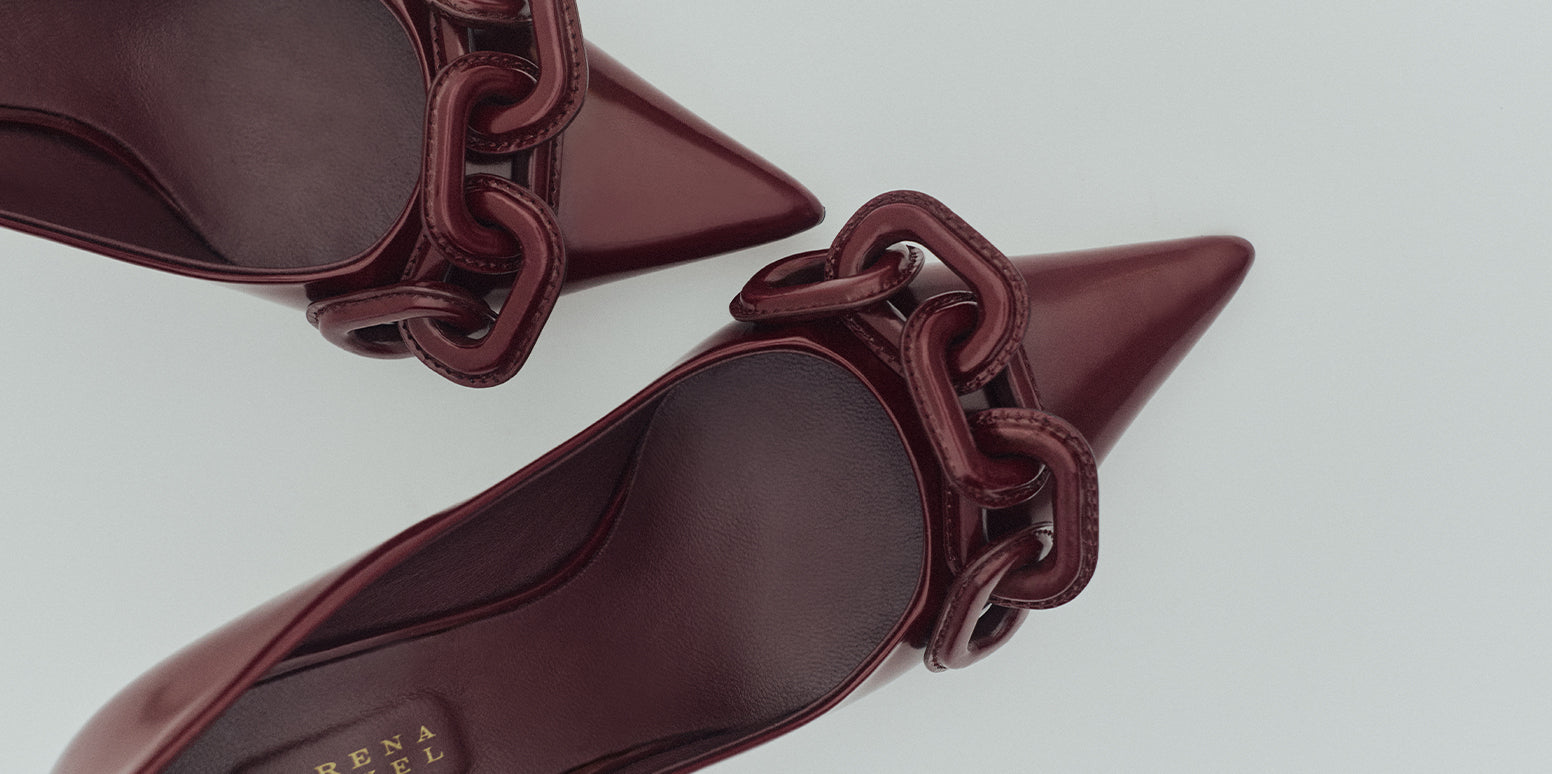 Handcrafted in Italy from patent burgundy leather with luxuriously lined in patent leather chains, the Catena Pumps feature a sleek pointed toe set on a slim 70mm stiletto heel. A result of Impeccable craftsmanship and timeless design, the pumps are detailed with a brand new iteration of Serena Uziyel’s signature Catena chain links, this time delicately wrapped in threads of sumptuous suede. Classic and easy to style, the pumps are ideal to pair with anything from tailoring to midi dresses.