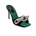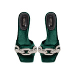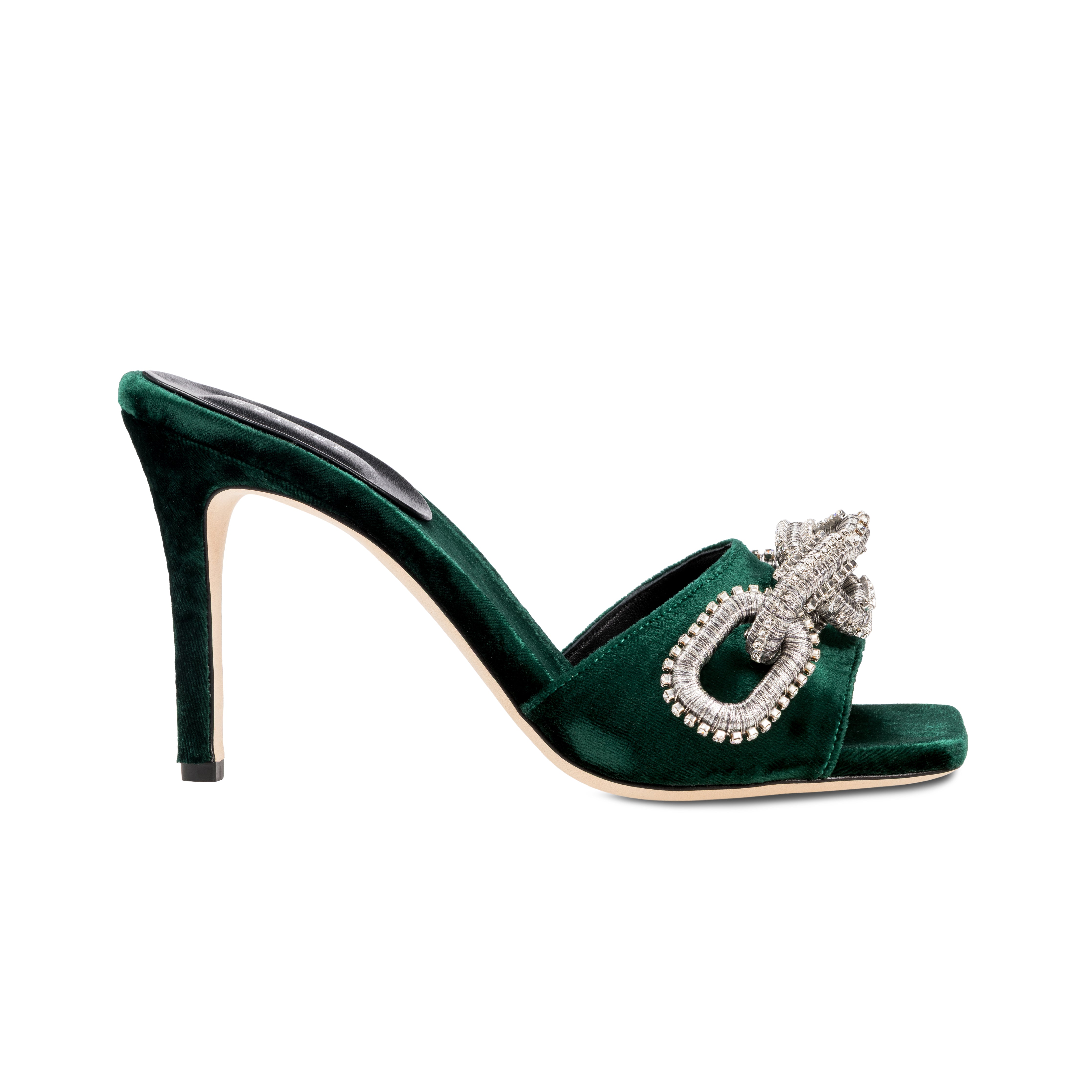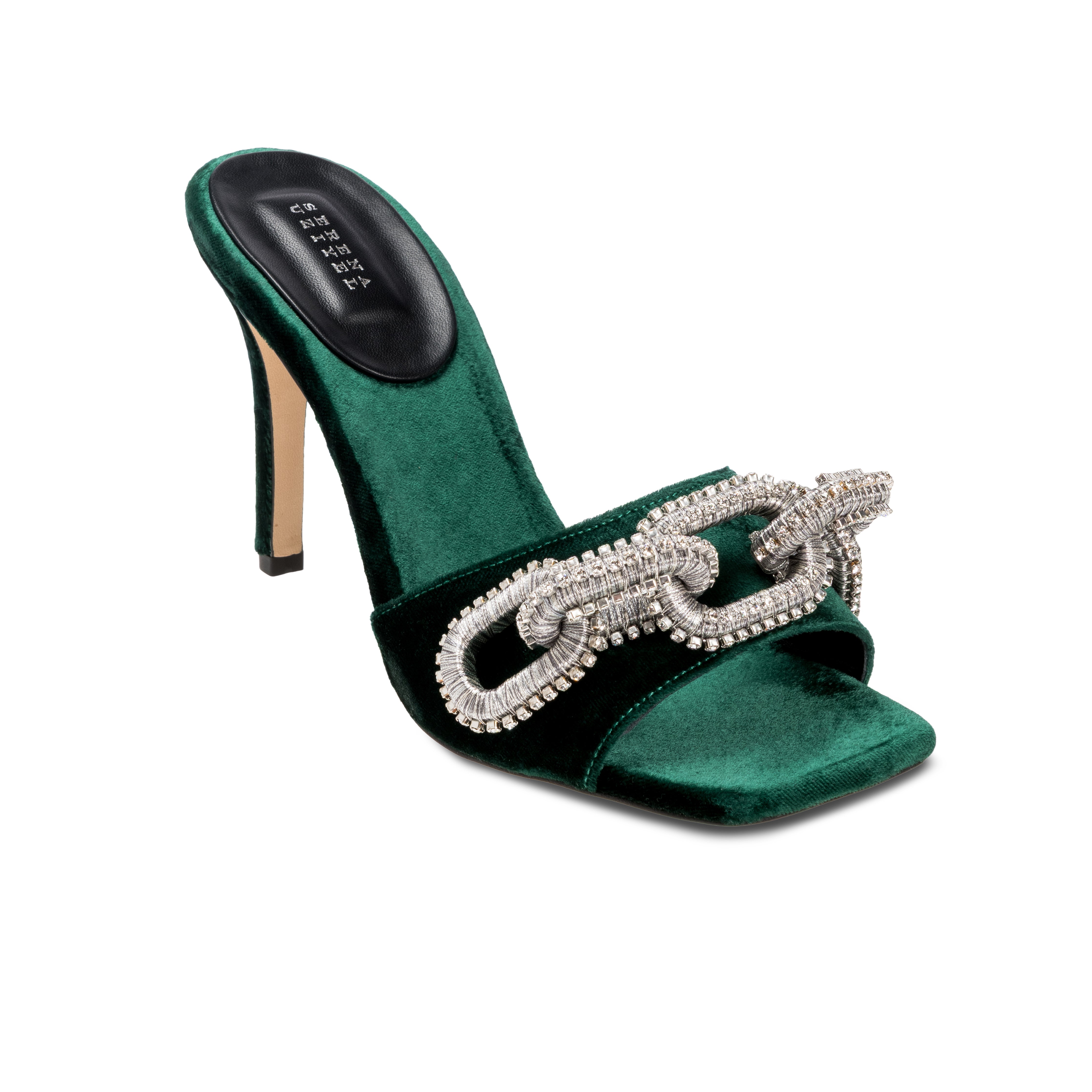 Boasting a sleek silhouette accented with delicate glimmering crystals, the Catena Scarlet Glam Sandals exude golden-era glamor. Set on elegant 90mm stiletto heels with padded insoles for extra comfort, the open-toe mules are crafted delicately in Italy from a sumptuous emerald colored velvet. The focal point of the shoe is undeniably the exquisitely handcrafted strap. Signature Serena Uziyel catena chain links are delicately wrapped in metallic threads, then wrapped again with crystal embellishments. The Catena Emerald Glam Sandals are the perfect finishing touch to a celebratory ensemble, sure to accompany you well through the finer hours.