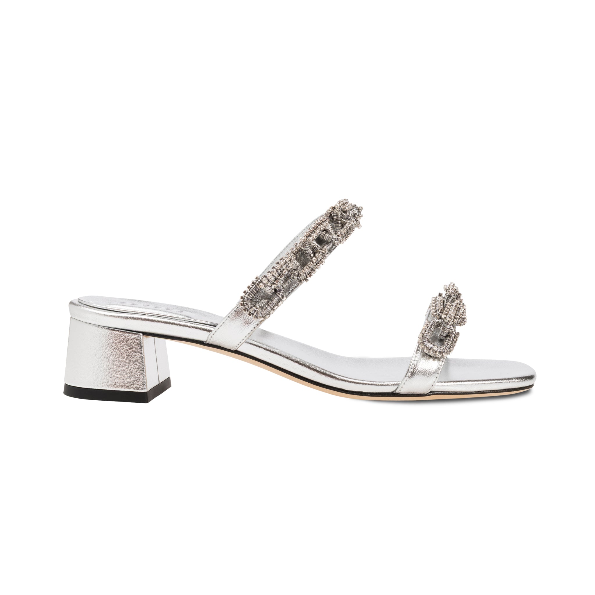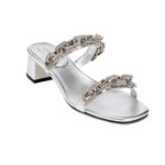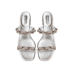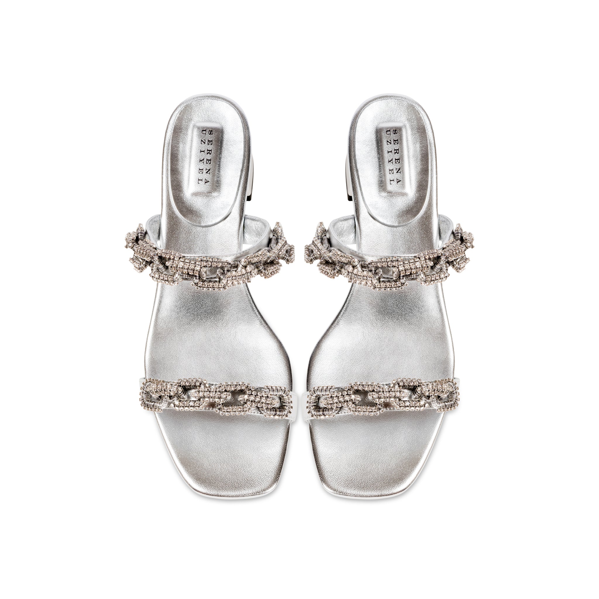 Slender and sophisticated, the Catena Notte Blush & Glam Sandals rest on an elegant block heel that offers both height and effortless comfort. Crafted from shimmering metallic silver leather, the design features two refined straps — the front strap adorned with jewel-like Catena chain link embroidery that instantly catches the light. Delicately embracing the foot like a jewelery, this signature Serena Uziyel embellishment is intricately wrapped by hand, adding a touch of heritage and artisanal craftsmanship to be admired for years to come.