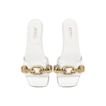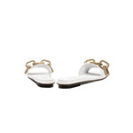 Crafted from pure Off-White Italian leather, the Catena Flat Sandal features antique gold and silver threads that are bound together to create rectangular chain shaped embroidery for contrast. The flat structure and the tactility of the beautiful leather will comfort your steps with delicacy.