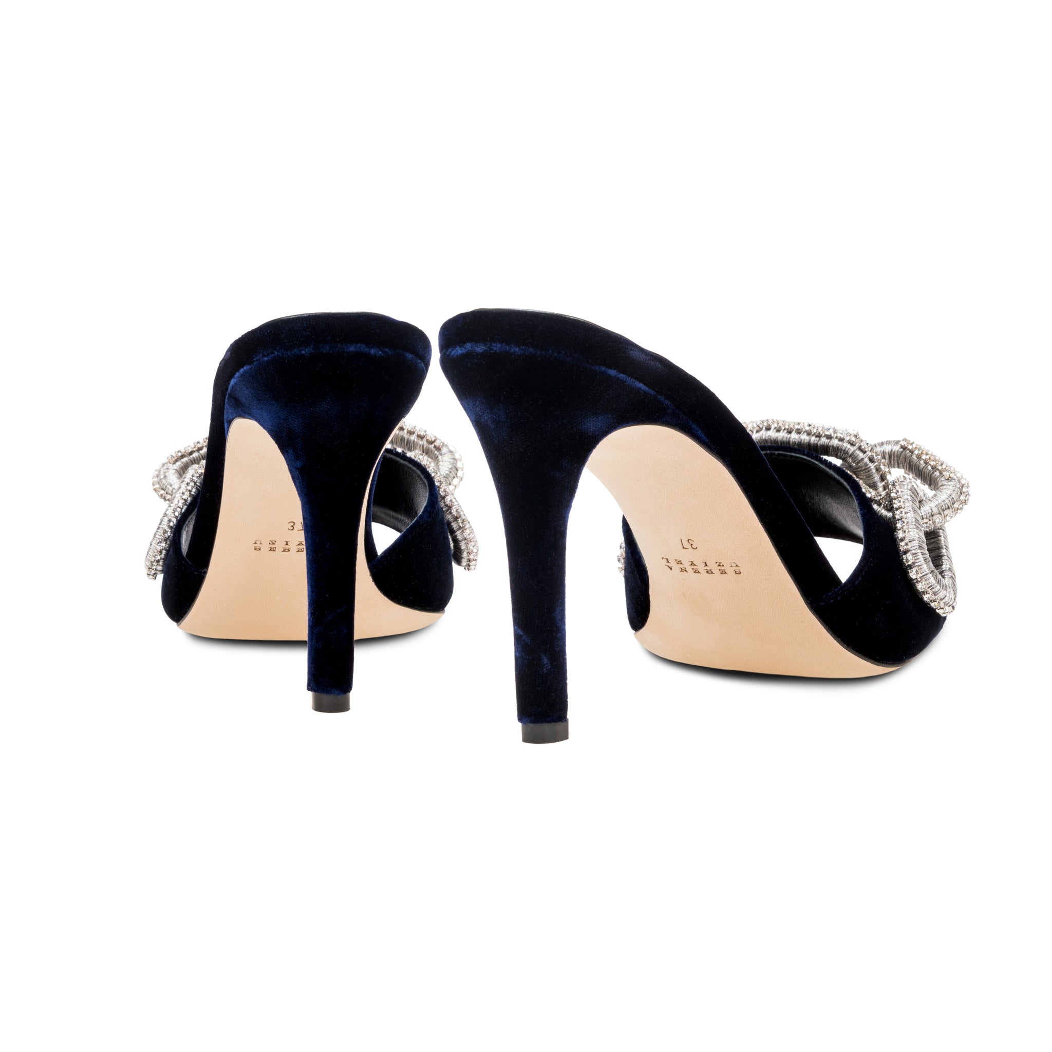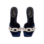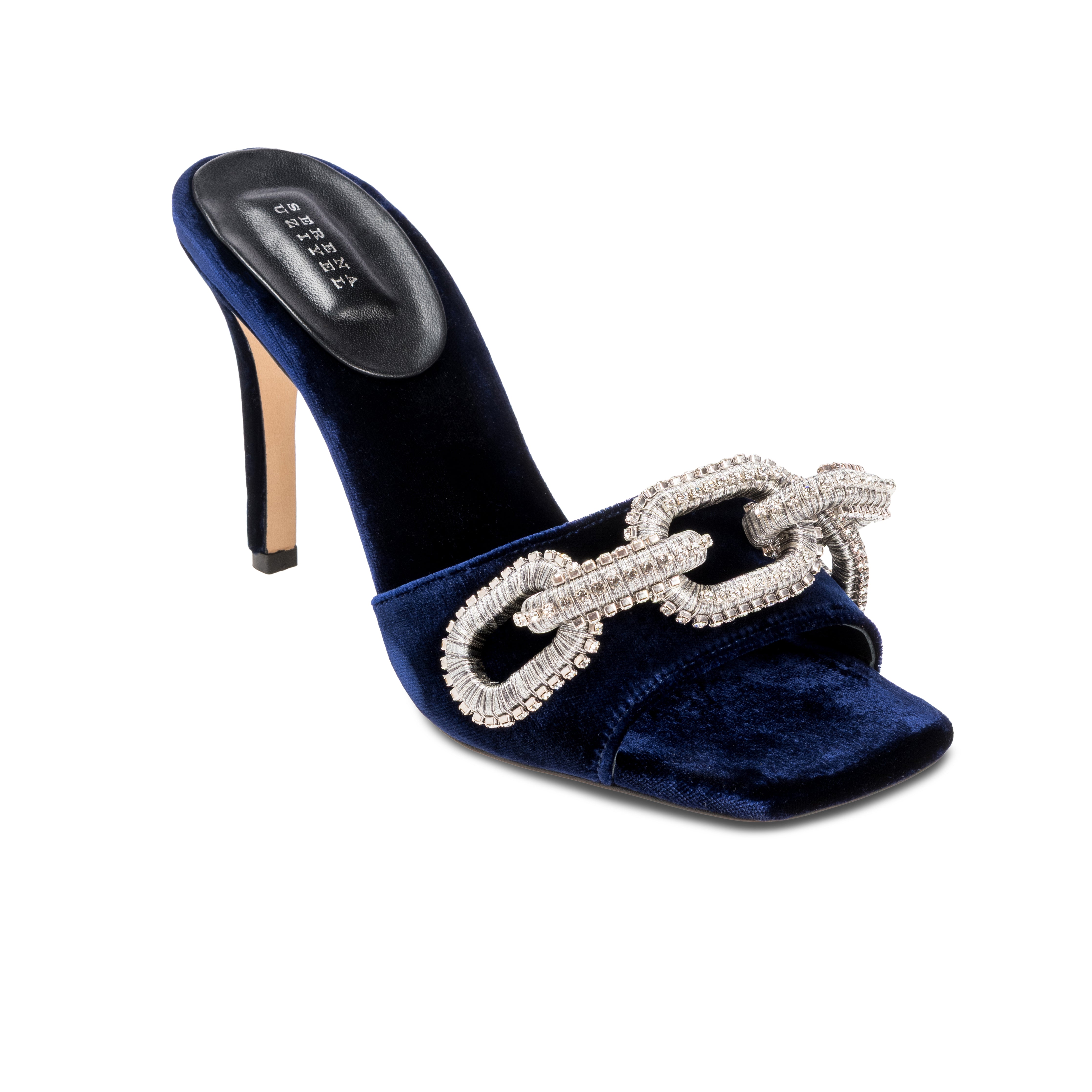 Boasting a sleek silhouette accented with delicate glimmering crystals, the Catena Scarlet Glam Sandals exude golden-era glamor. Set on elegant 90mm stiletto heels with padded insoles for extra comfort, the open-toe mules are crafted delicately in Italy from a sumptuous sapphire colored velvet. The focal point of the shoe is undeniably the exquisitely handcrafted strap. Signature Serena Uziyel catena chain links are delicately wrapped in metallic threads, then wrapped again with crystal embellishments. The Catena Sapphire Glam Sandals are the perfect finishing touch to a celebratory ensemble, sure to accompany you well through the finer hours.