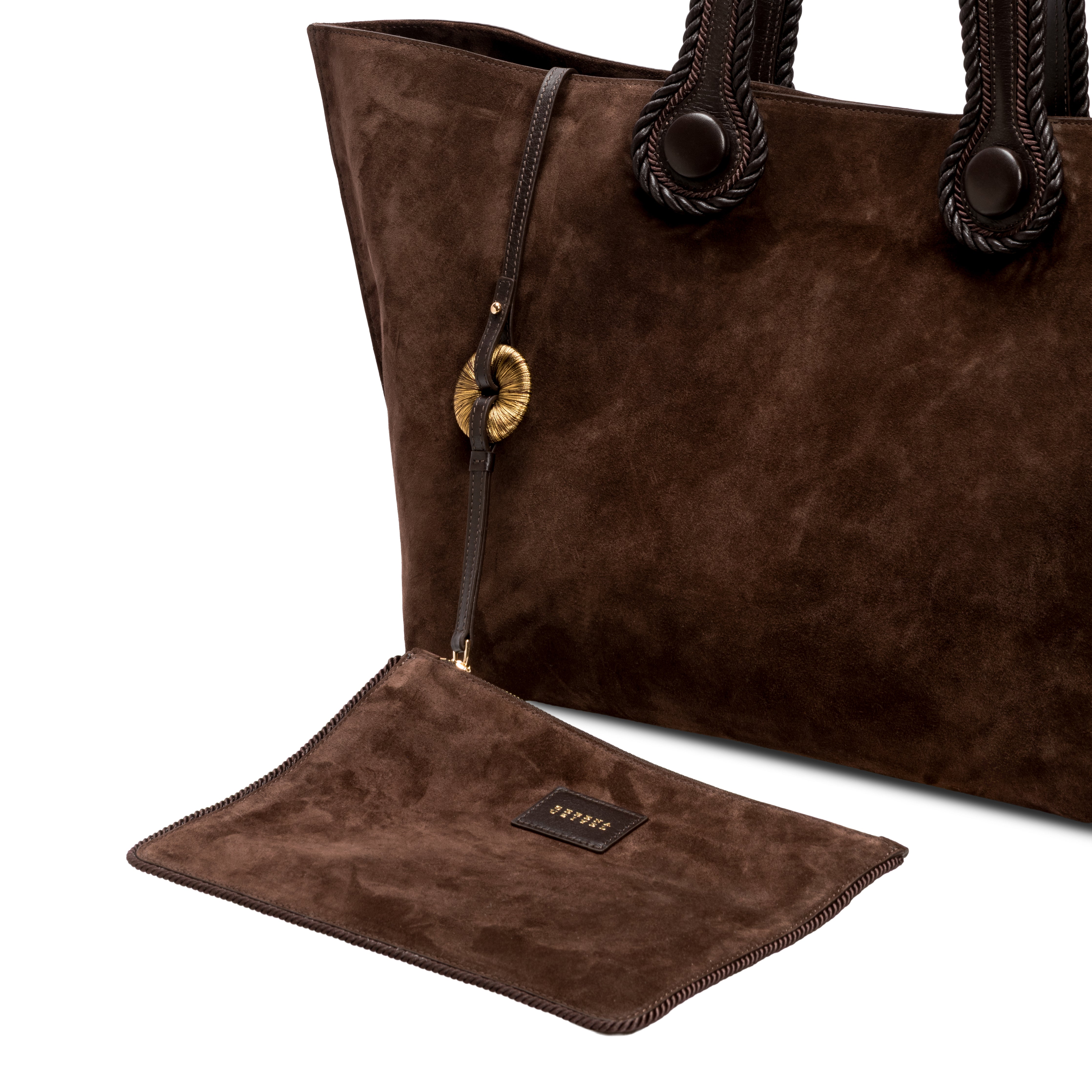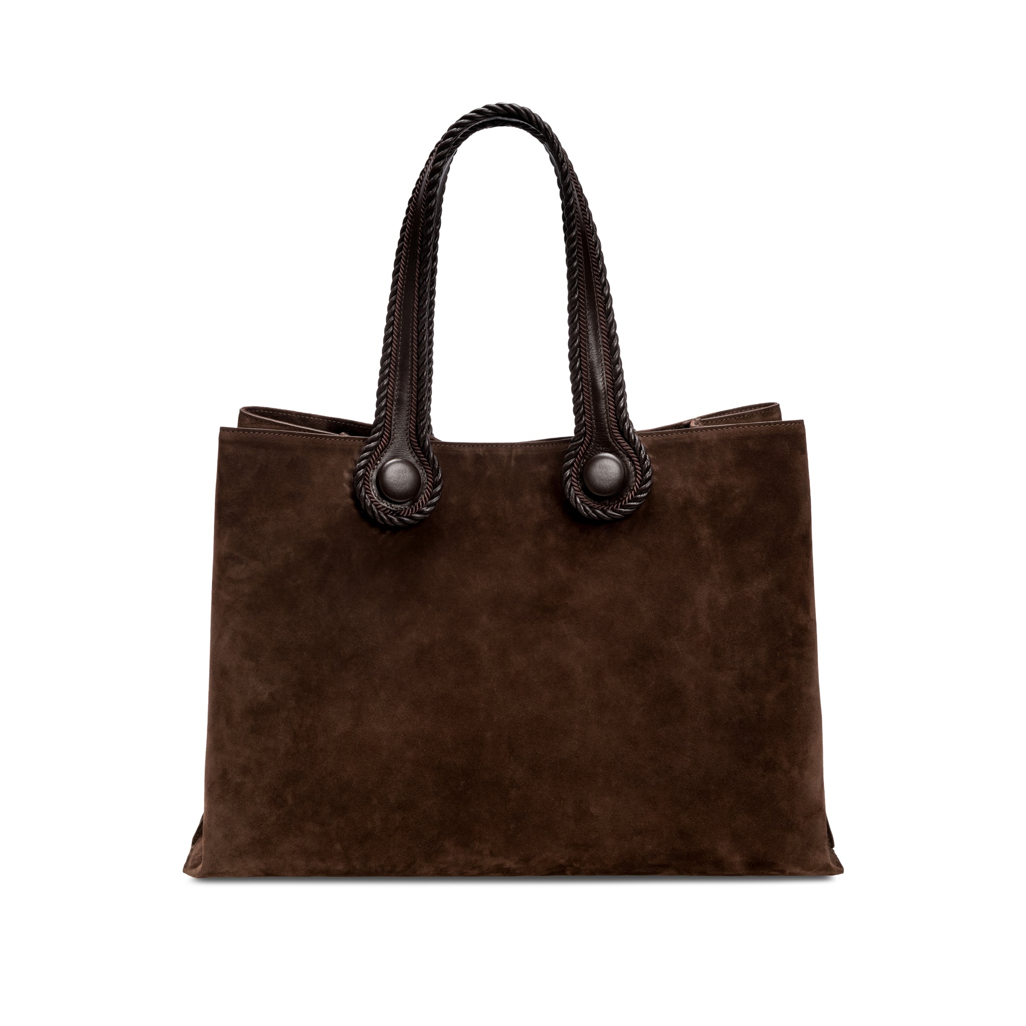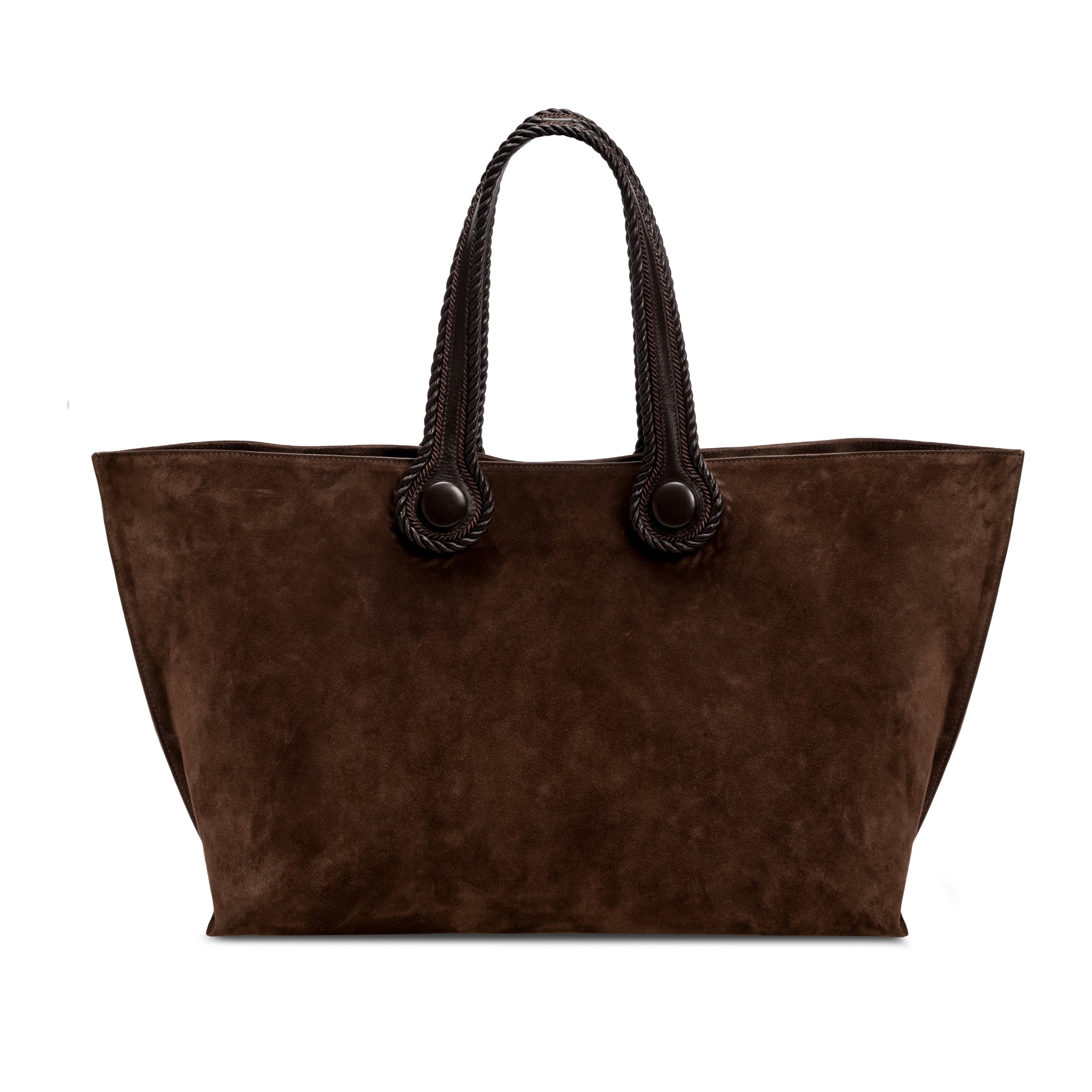 An oversized carry-all with a sleek, understated body and statement detailing, crafted in Italy from velvety midnight-black suede. Its structured, boxy silhouette is generously sized—fit for a laptop, layers, and travel essentials—making it as practical for the daily commute as it is for a long-haul flight. Wide, sculptural leather handles, subtly trimmed with woven leather, sit comfortably on the shoulder and add depth and distinction. Minimal yet striking, it embodies the Serena Uziyel aesthetic—equally at ease in the city or on a weekend escape.