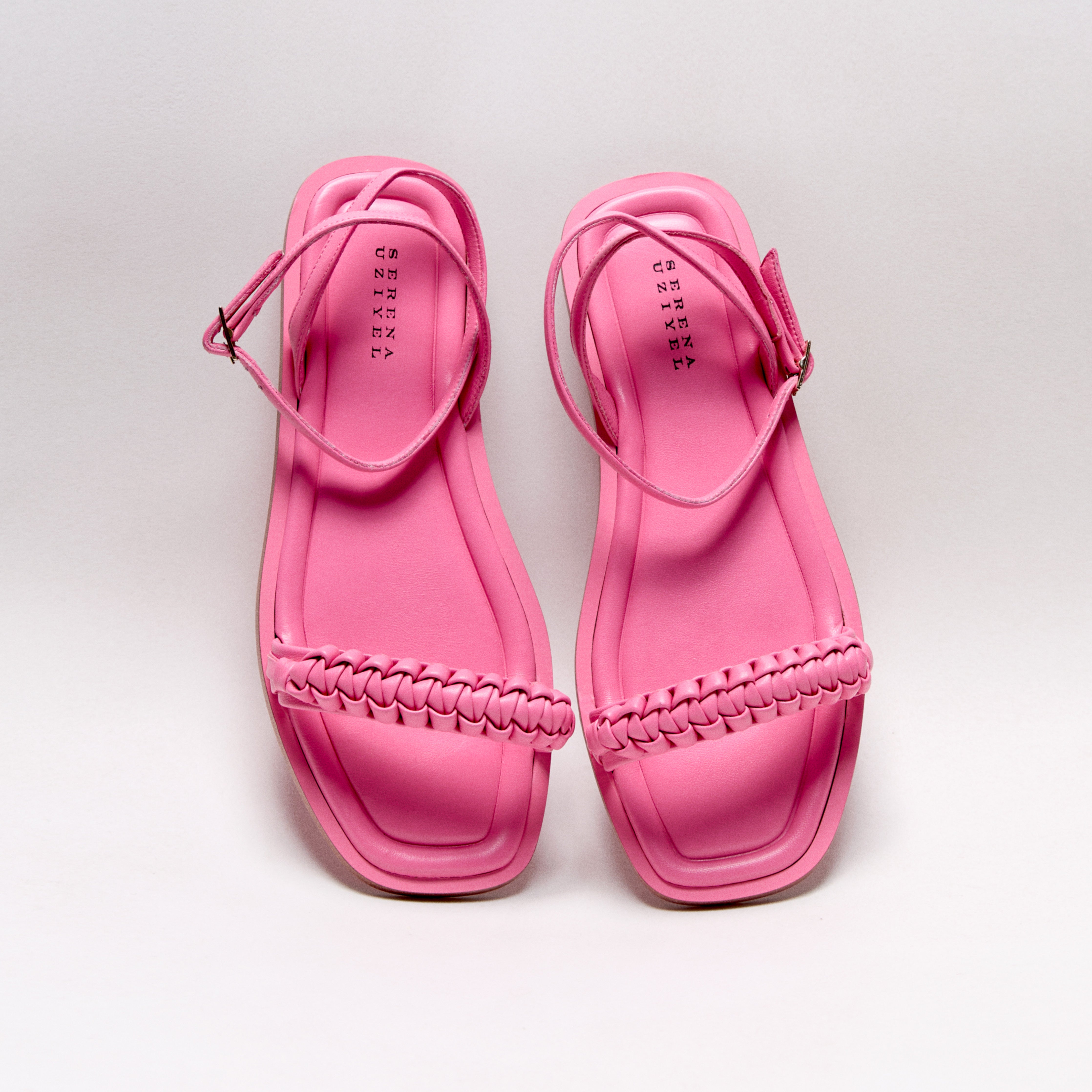 A modern classic, the Kibele Flat Sandal is crafted in Italy from supple leather. Designed with rounded toes, it features a braided bubble pink front strap and a sleek cross-strap that gracefully embraces the sole and ankle. A versatile essential, perfect for pairing with everything from slip dresses to tailoring.