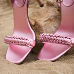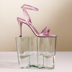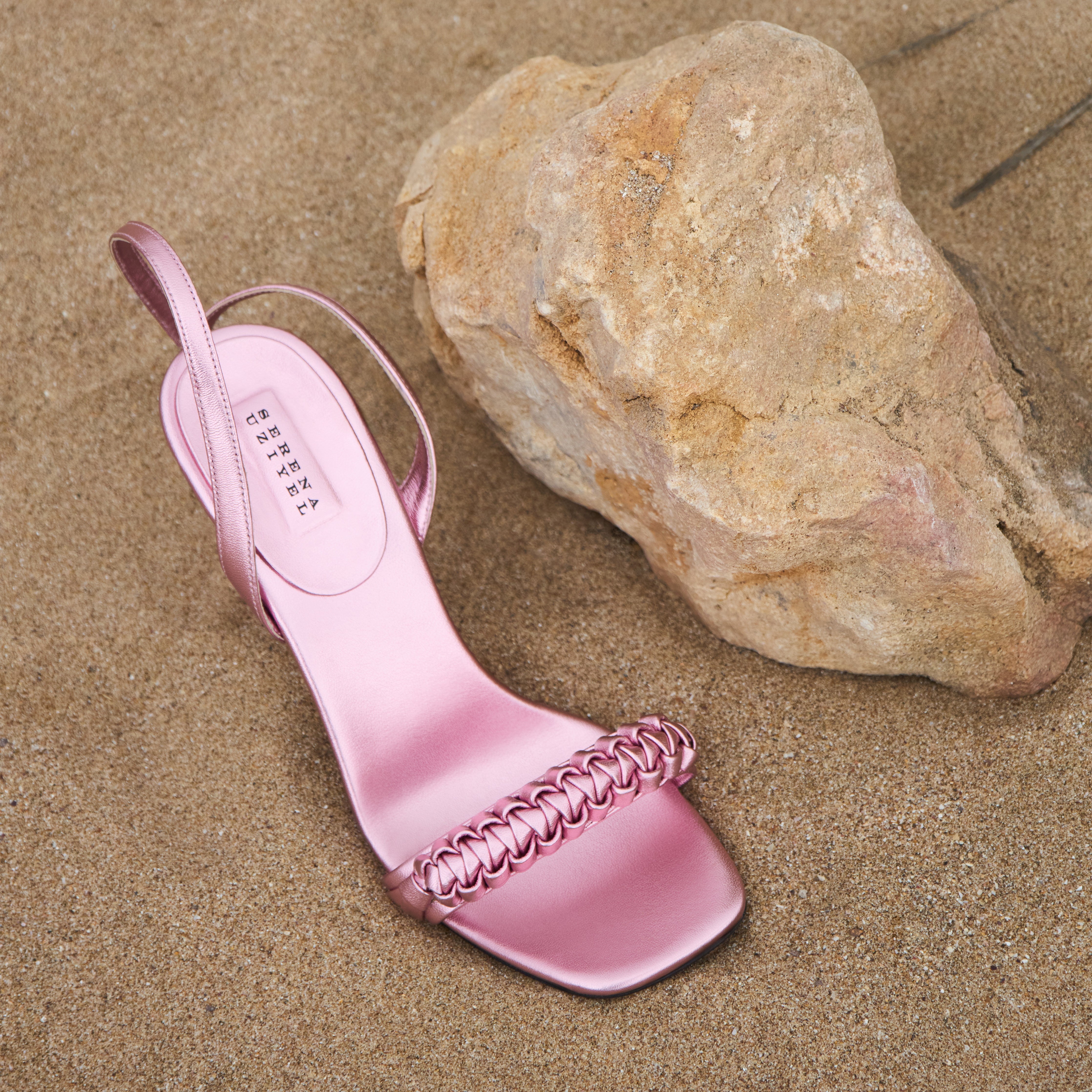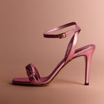 The Kybele High Heel Sandal blends delicate structure with bold femininity. Made in Italy from shimmering pink metallic leather, this design is set on a slender stiletto heel and features a dainty ankle strap with a sleek, minimalist 90’s-inspired silhouette. The slim front strap is adorned with intricate Kybele embroidery, making it the perfect complement to a party dress or an elegant evening ensemble.