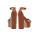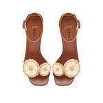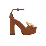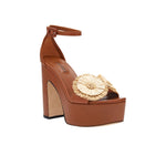 A narcissus flower perched atop sky-scraping platform heels in camello leather. Handmade by a community of women artisans, over five hours of meticulous craft goes into the creation of these joyful flowers.