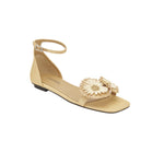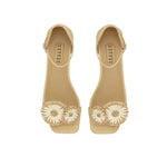 Reminiscent of a sea of swaying daffodils, daisies and dandelions, the oversize handwoven narcissus flowers are a celebration of all things summer, southern, and sunny. Summer flats in natural raffia crafted to accompany your summer escapes.