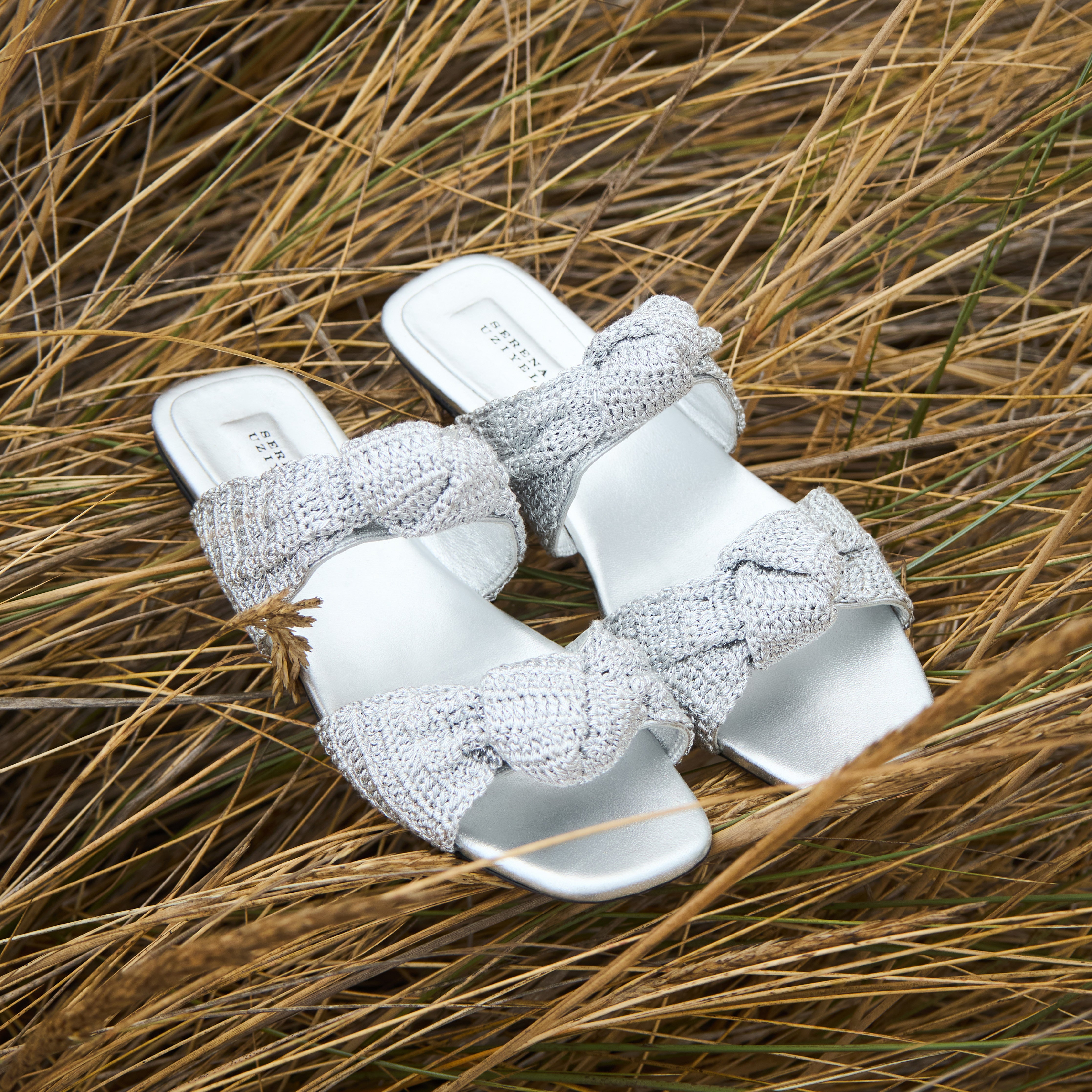 The Rhea Two-Strap Flat Sandal blends artisanal craftsmanship with effortless elegance. Handmade using centuries-old techniques, this design features two intricately knotted crochet leather straps, creating a sculptural, three-dimensional effect enhanced by the rich interplay of metallic threads. Crafted from supple leather in Silver, the sandal is finished with a gently cushioned leather insole for all-day comfort. A versatile essential, perfect for sightseeing on vacation or elevating warm-weather ensembles with ease.