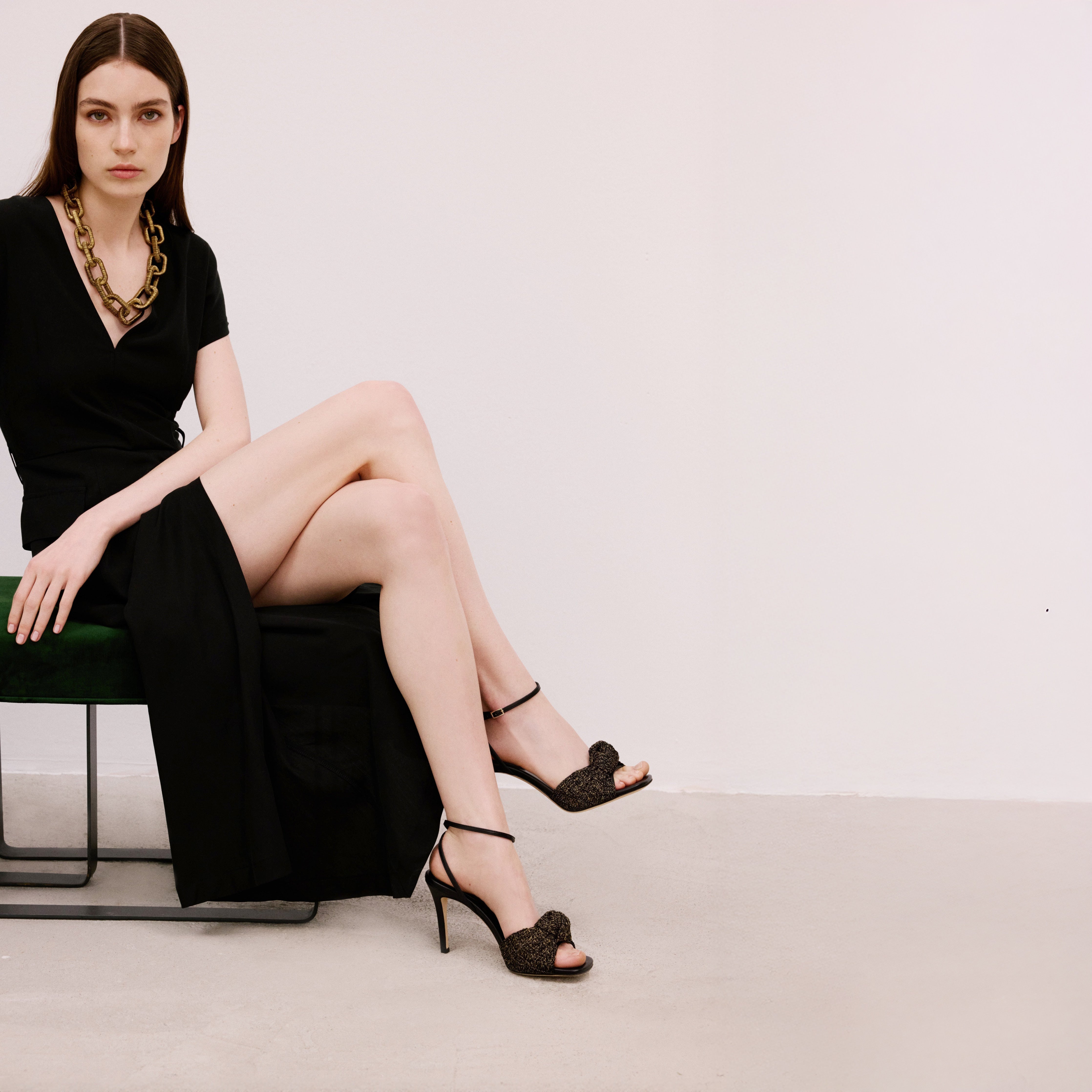 A striking blend of craftsmanship and sophistication, the Rhea Ankle Cross Sandal is crafted in Italy from smooth black leather and crochet. Its sleek silhouette is elegantly framed by slim straps that crisscross at the front, while a delicate ankle strap ensures a secure and refined fit. The standout detail—a statement front strap intricately knotted from black and gold shimmering crochet—adds texture and depth to the design. Set on a 90mm stiletto heel, this sandal is a bold yet versatile choice for any occasion.