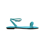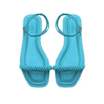 The Rovena Ankle Sandal is crafted in Italy from a soft and supple leather in aqua blue. With a squared toe and a sleek, modern and minimal silhouette, this is a flat sandal with slender and elegant straps that lightly embrace the ankle. A handwoven front strap has been intricately crafted from braided leather, adding a striking and sculptural element. With a lightly cushioned footbed for a comfortable step, the Rovena ankle sandal is perfect for summer days out and about, from poolside lunches to elegant dinners. Pair with everything from slip dresses to tailoring.