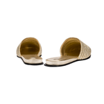 Meet the utterly feminine Bellina sliperette, delicately crafted from luxurious metallic sahara colored leather and adorned with a breathtaking combination of gold silver braid. With a dainty fifteen millimeters uplift, these sliperettes offer a subtle boost while preserving a beautifully feminine silhouette. Slip into the captivating Bellina sliperette and embrace the magnetic allure at every step.