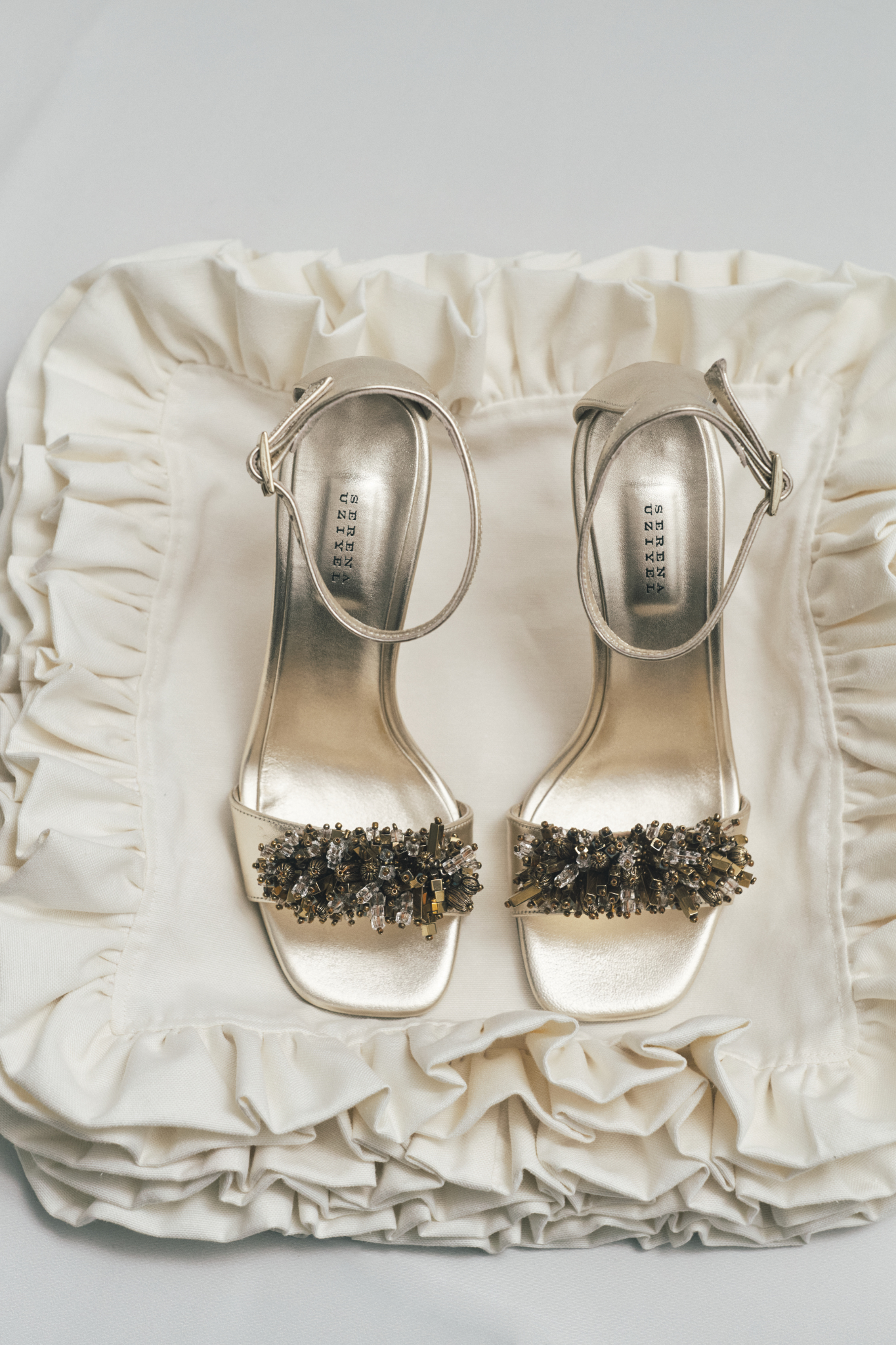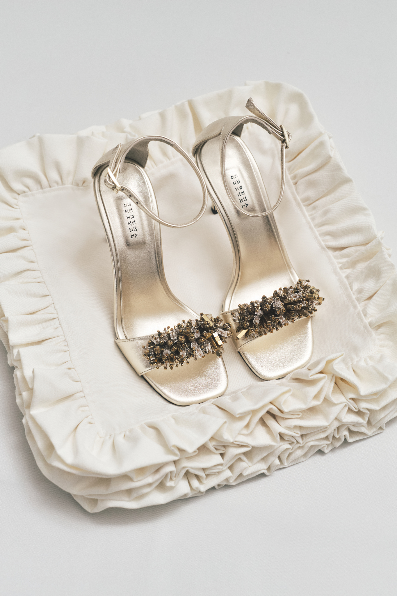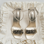 The front strap is intricately hand-embellished with beads and luminous stones in tonal variation and sculptural form, creating a rich, three-dimensional texture that catches the light with every step.