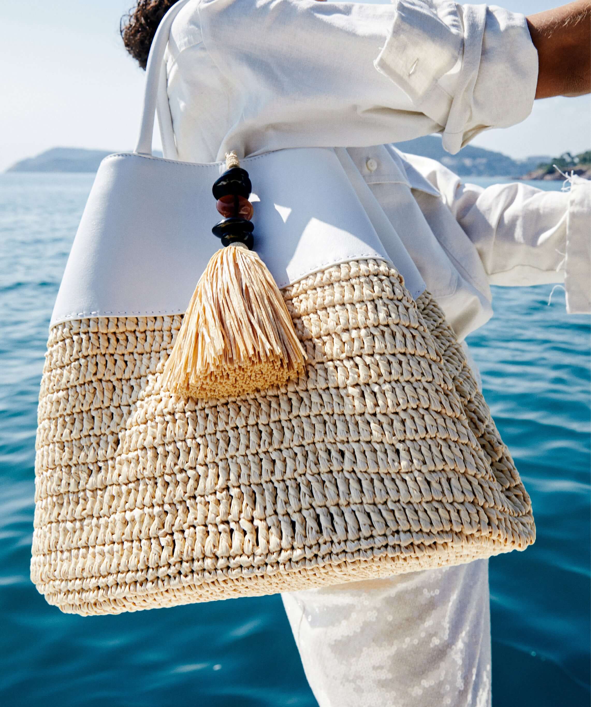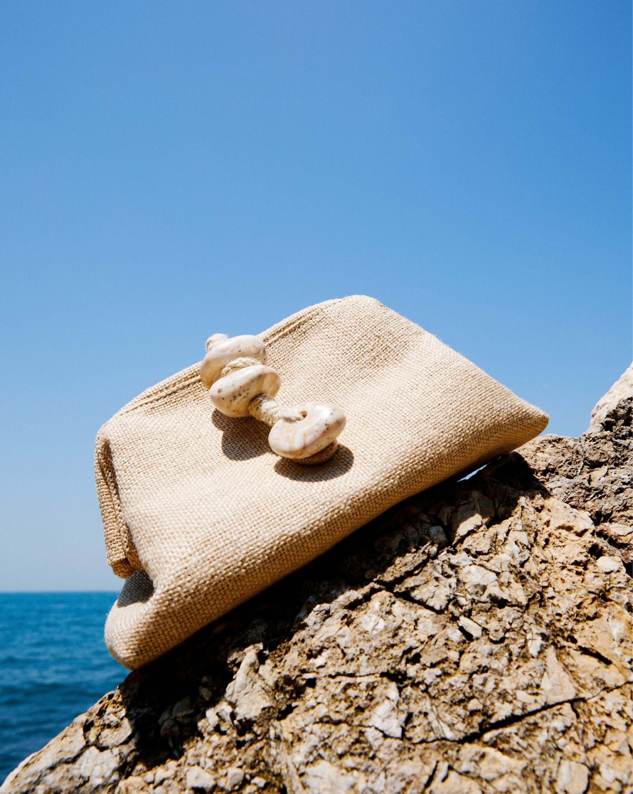 Radiant natural stones woven with threads of raw raffia and canvas to accompany journeys through the south.